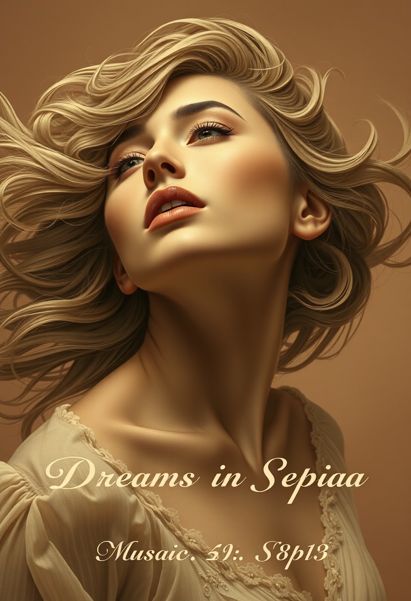 high quality design aesthetics, dynamic, detailed, pop album cover, beautiful young white woman, artist name "Musaic", album title "Dreams in Sepia"