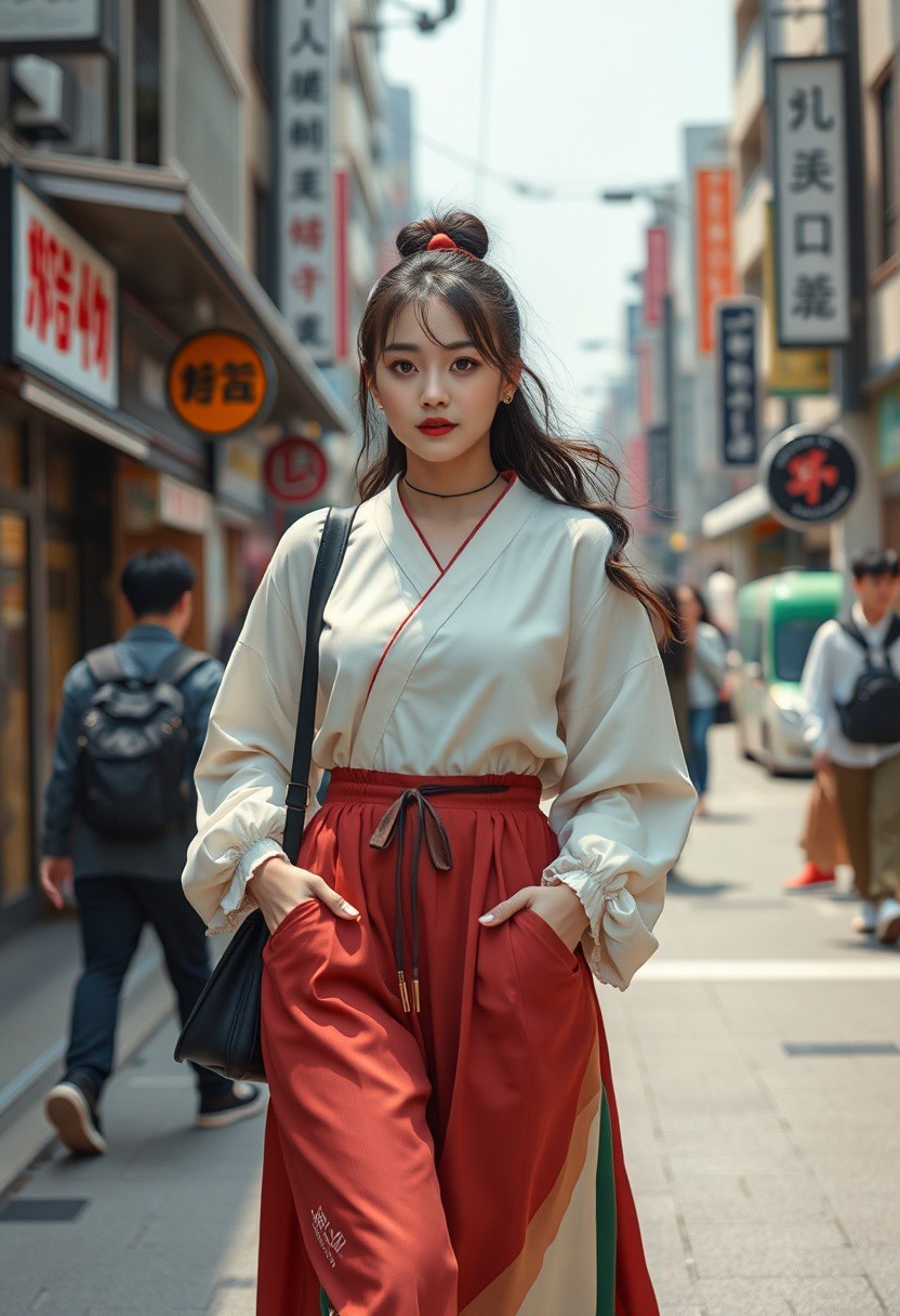 A young Korean woman wearing a modern streetwear outfit inspired by traditional hanbok, walking through a busy Seoul street, realistic style, high detail, fashionable and trendy, urban vibe.