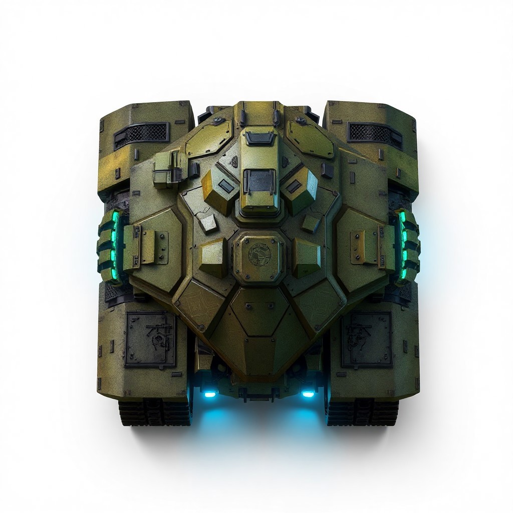 ((top view)), (tank), Wide and flat tank with an arched dorsal spine and side-mounted armor slabs. Chassis: Regenerative plating arranged in layered hex cells. Vines of nano-cabling crisscross beneath the surface. Tracks: Wide dual treads with spore-filter grills covering each tread module. Details: Bio-gel sacs protrude along side armor; side compartments vent steam during overclocked regen. Lights: Blue-green capillaries shimmer under armor. Thin halos radiate from under tread housings.
