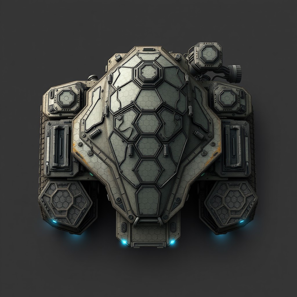 ((top view)), (tank), Wide and flat tank with an arched dorsal spine and side-mounted armor slabs. Chassis: Regenerative plating arranged in layered hex cells. Vines of nano-cabling crisscross beneath the surface. Tracks: Wide dual treads with spore-filter grills covering each tread module. Details: Bio-gel sacs protrude along side armor; side compartments vent steam during overclocked regen. Lights: Blue-green capillaries shimmer under armor. Thin halos radiate from under tread housings.