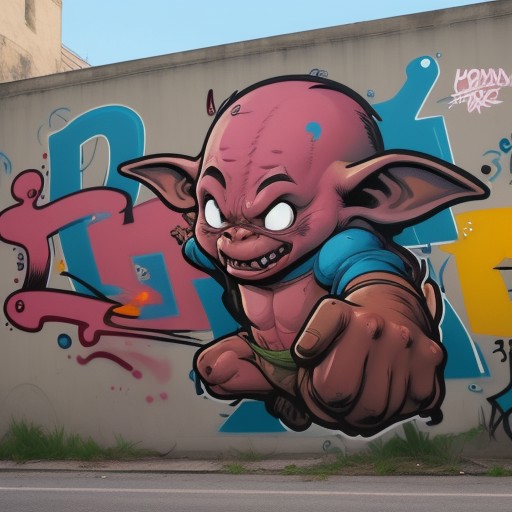 (Masterpiece of painting:1.3), modern streetart, graffitti art, writing, character, on a wall, huge, large, crazy painting, thick outlines, flat style, highlights, fadings, shading, (flat comic style character:1.3), simple color scheme, mascot, goblin, highly detailed, impressive, surprising, meaningful, fullscreen, taggings, frameless,