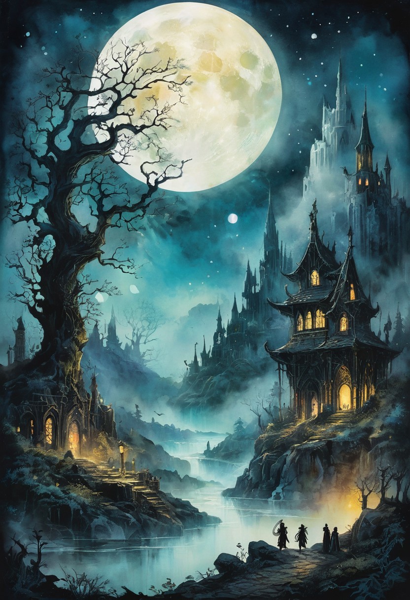 A breathtakingly intricate storybook illustration of the Lost Land of Otherworldly Dreams, set beneath a midnight sky drenched in gothic gloom. The moon casts a cold, ethereal glow across a fog-wreathed landscape filled with mythological figures and ancient ruins. Crafted with a mix of watercolor, ink, and acrylic on cracked, timeworn paper, the composition features double exposure elements—blending mysterious forests with spectral beings and glowing magical artifacts. The scene teems with vibrant colors and luminist glow, yet shrouded in deep shadows and mist. Every inch of the artwork bursts with ultra-fine details—tiny runes etched on crumbling stones, glowing eyes in the fog, enchanted flora radiating soft light. A perfect harmony of mystical narrative and cinematic scale, this artwork invites the viewer into a forgotten realm of dreams, spells, and shadowy myths.