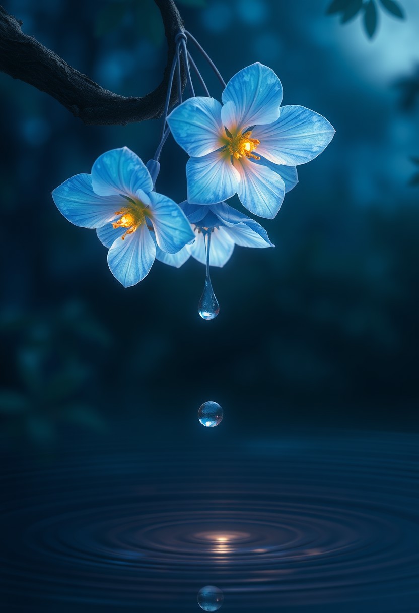 <lora:Anime_Scenery_style_v.1:0.8> AnimeScenery style. Three luminous rainbow blossoms float like starlight on a gnarled branch, their delicate petals glowing with soft gradients of sapphire and cerulean as golden stamens sparkle against the velvety shadows of a moonlit forest. Suspended beneath the lowest leaf, a crystal drop of dew descends in slow motion, just above a still, obsidian pool where gentle ripples radiate outward in concentric rings of pale light. The background fades into deep cobalt and indigo, with bokeh glimmers hinting at unseen foliage in a dreamlike haze. Rendered in ultra-high detail with a shallow depth of field and soft overhead lighting, the scene balances surreal botanical elegance with a quiet aquatic atmosphere. A complementary palette of cool blues and warm gold punctuates the darkness, while the composition's vertical symmetry draws the viewer's eye from blossom to droplet to ripple, creating a meditative, weightless moment frozen in enchanted stillness.