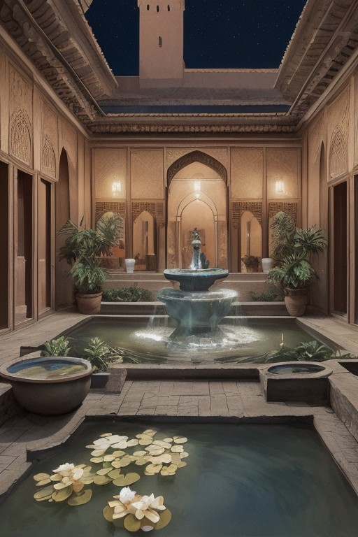 A dinkfsn style ink wash painting Nice inner courtyard of Arabic traditional Moroccan house, a pond with fountain,sitting area، night time, people in courtyard (((sharp focus))), (hyperdetailed:1.3), (intricate details:1.2), (Refined details:1.3), (best quality:1.5), highly detailed textures, vibrant colours, (ultra sharp focus:1.3)