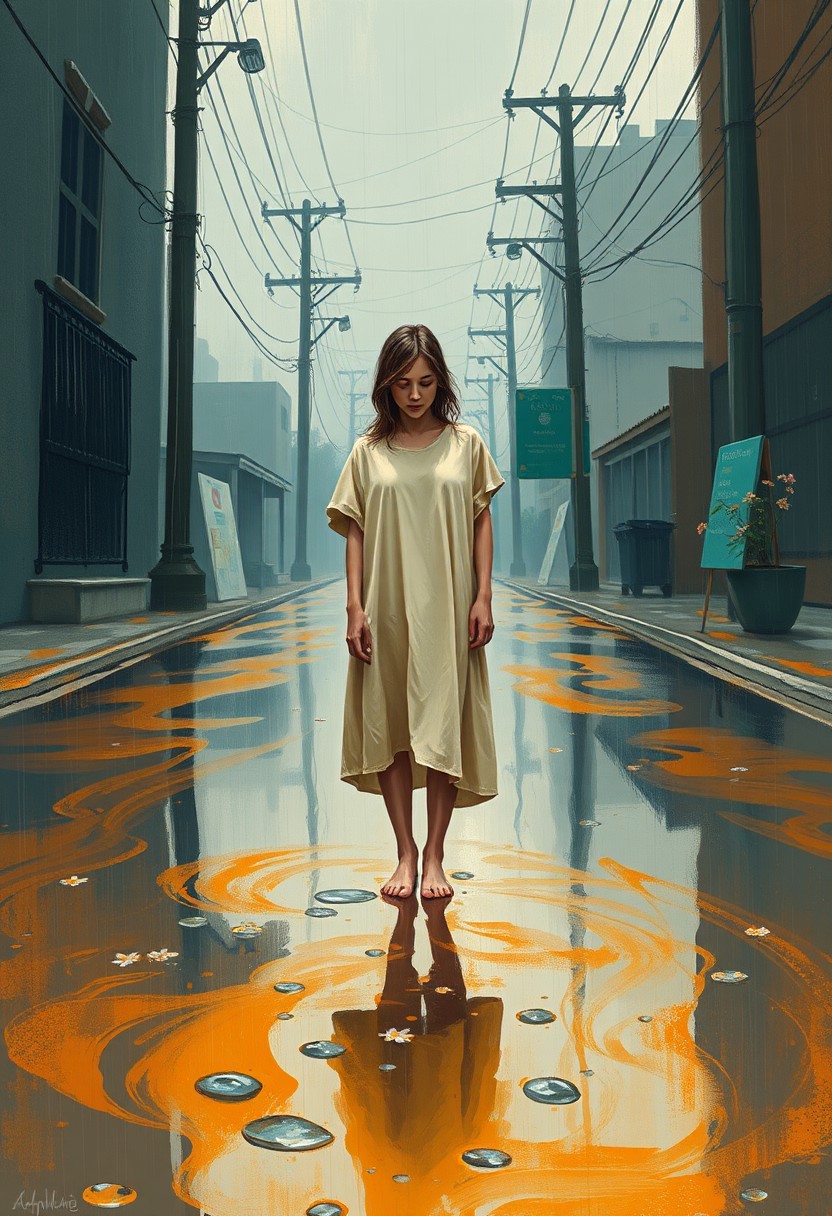 A lone figure stands barefoot in the middle of a rain-soaked street during a quiet summer afternoon. The scene captures a gentle melancholic mood, with large expressive brush strokes painting the wet pavement in rich, swirling textures of deep blue, burnt orange, and ochre. The figure, draped in a loose cotton dress, gazes downward with eyes half-closed, embodying introspection and emotional softness. Raindrops ripple in puddles around her, distorting reflections of telephone lines and scattered flowers. The background is simplified, almost abstract, yet emotionally charged with uneven geometry and warm contrasts. A soft overcast sky provides diffuse lighting, casting long, faint shadows and enhancing the damp sheen of the scene. The composition feels poetic and intimate, with every element—raindrop, wet concrete, posture—carrying symbolic weight. The figure is centered, the emotional core, surrounded by the textured blur of a nostalgic urban summer washed in rain.