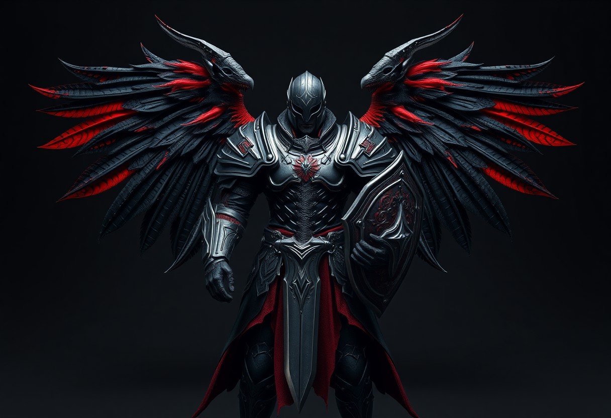 A dark fantasy Matte Painting rendered in Houdini Style and Grammer Effect, featuring a grimdark armored figure positioned center frame against a deep dark gray backdrop. The figure possesses an aura of overwhelming power, encased in highly detailed black armor accented with vivid red, and a helmet with a hidden visor. Expansive black wings with touches of red signify its otherworldly nature. A battle-ready sword is in the right hand, and a defensive shield in the left. This is a High-res, 4K, Exceptional Quality image with More Detail, Lifelike Details, Super Detailed Face and Eyes and Clothes (armor intricacies), Handcrafted with Precision, High Quality, Sharp Lines and Brush Strokes, Stunning Colors, Harmonious Colors, Multi Colored tones, Contemporary Aesthetics, Impeccable Composition, Creative Angle, Attractive Background, Balanced Editing, Intentional Focus, Well-timed Moment. The view is Isometric, capturing a Dynamic Action Pose with Captivating Lighting, rendered with an Octane Render approach, achieving Vivid Emotions and a Powerful Message, with Beautiful Detailed Eyes (as part of the detailed aesthetic). Inspired by CGSociety and trending on ArtstationHQ, composed according to the Golden Ratio.
