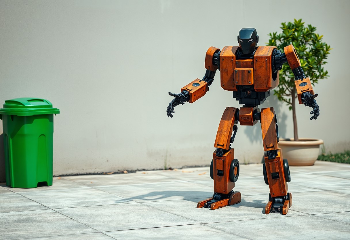 A large, imposing biorobot, meticulously constructed from textured wood and aged metal, dominates the center of the frame. Its body is a vibrant, multi-colored mix of orange and brown hues, contrasting sharply with its stark black head. Standing tall on a weathered concrete patio, its substantial form casts a dynamic shadow. The robot's arms are outstretched, poised as if ready for immediate action, while its legs are spread wide in a powerful stance of readiness. In the slightly blurred background, a vivid green trash can and a sturdy tree stand, adding elements of the ordinary to this extraordinary scene. The composition is impeccable, with the robot as the clear focal point, utilizing a creative angle and intentional focus. This is a high-res, 4K photographic render with Exceptional Quality and Lifelike Details. Super Detailed Face and Eyes, although a robot, show mechanical precision and detail. Handcrafted with Precision, High Quality, Contemporary Aesthetics, Impeccable Composition, Attractive Background, Balanced Editing, Well-timed Moment, Dynamic Action Pose, Captivating Lighting. CGSociety, Artstation Trending on ArtstationHQ. Golden Ratio applied. No text.