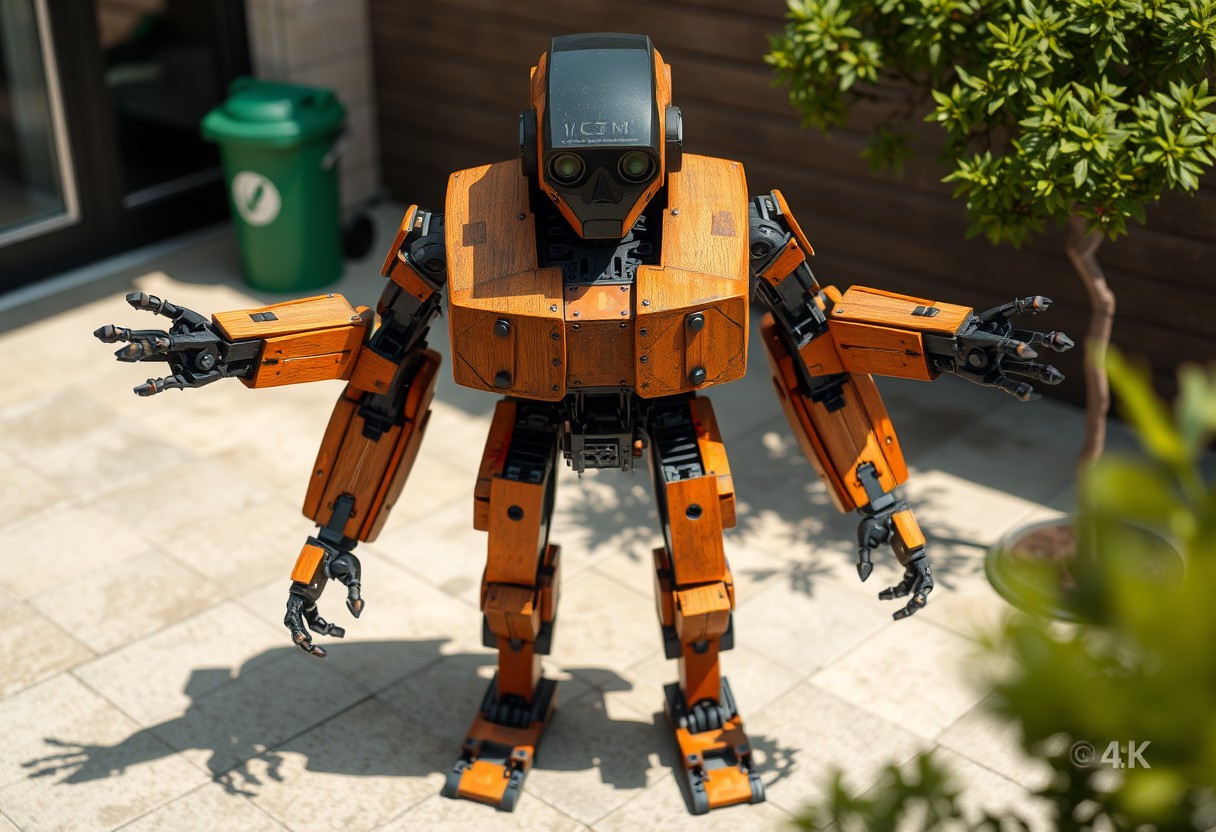 A large, imposing biorobot, meticulously constructed from textured wood and aged metal, dominates the center of the frame. Its body is a vibrant, multi-colored mix of orange and brown hues, contrasting sharply with its stark black head. Standing tall on a weathered concrete patio, its substantial form casts a dynamic shadow. The robot's arms are outstretched, poised as if ready for immediate action, while its legs are spread wide in a powerful stance of readiness. In the slightly blurred background, a vivid green trash can and a sturdy tree stand, adding elements of the ordinary to this extraordinary scene. The composition is impeccable, with the robot as the clear focal point, utilizing a creative angle and intentional focus. This is a high-res, 4K photographic render with Exceptional Quality and Lifelike Details. Super Detailed Face and Eyes, although a robot, show mechanical precision and detail. Handcrafted with Precision, High Quality, Contemporary Aesthetics, Impeccable Composition, Attractive Background, Balanced Editing, Well-timed Moment, Dynamic Action Pose, Captivating Lighting. CGSociety, Artstation Trending on ArtstationHQ. Golden Ratio applied. No text.