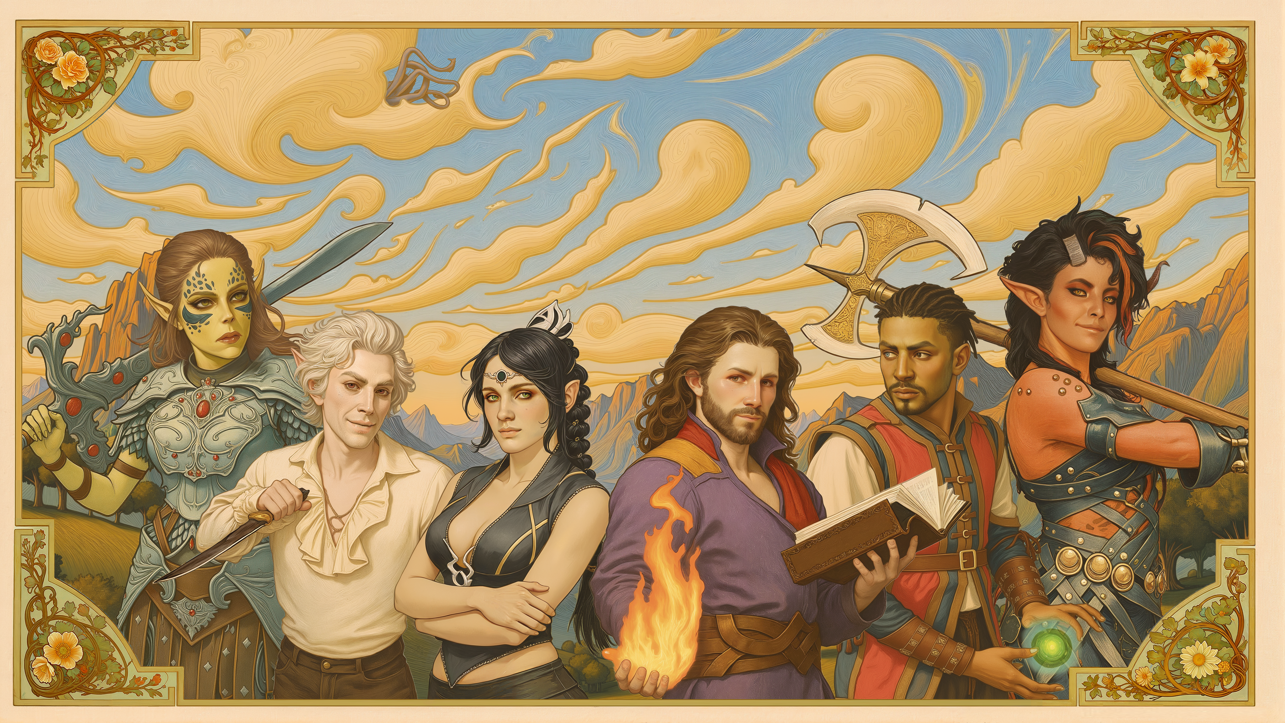 various prompts and methods were applied, Laezel, Lae'zel, Astarion, Shadowheart, Gale, Wyll, Karlach, Baldur's Gate 3, Baldurs Gate 3, wallpaper, poster, background, art nouveau style, Alphonse Mucha Style, ArsMJStyle, Art Nouveau, AlfMch, style of Alphonse Mucha, best quality, ultra-detailed, <lora:Alphonse Mucha Style:0.5>, <lora:tbh200-sdxl:0.5>, <lora:InspiredbyMucha:1>
