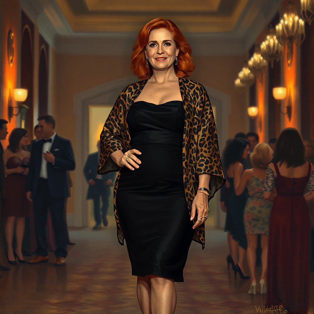 full body shot masterpiece portrait of a woman::1.4, Norman Rockwell style::1.2, realistic impressionist art::1.1, (physical description: mature woman,red hair, light skin, confident posture, chubby build:1.1) (facial features, expression: elegant, poised, subtle smile:1.0) (clothing details: black strapless dress paired with a leopard print kimono-style jacket, black platform sandals:1.0) (accessories: minimal or no jewelry, natural makeup for an evening gala look:0.9) (background setting: evening gala event at, subtle crowd and venue details:0.9) (lighting style: warm, soft evening event lighting, highlights on dress textures and jacket pattern:0.8) (composition and camera framing: three-quarter length portrait, subject centered, slight angle to highlight outfit:1.0) (emotional tone or theme: stylish, refined, celebratory mood:0.9) (technical execution: oil painting texture, rich detail on fabric patterns and folds, balanced warm contrast:0.8)