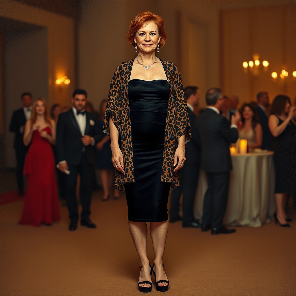 full body shot masterpiece portrait of a woman::1.4, Norman Rockwell style::1.2, realistic impressionist art::1.1, (physical description: mature woman,red hair, light skin, confident posture, chubby build:1.1) (facial features, expression: elegant, poised, subtle smile:1.0) (clothing details: black strapless dress paired with a leopard print kimono-style jacket, black platform sandals:1.0) (accessories: minimal or no jewelry, natural makeup for an evening gala look:0.9) (background setting: evening gala event at, subtle crowd and venue details:0.9) (lighting style: warm, soft evening event lighting, highlights on dress textures and jacket pattern:0.8) (composition and camera framing: three-quarter length portrait, subject centered, slight angle to highlight outfit:1.0) (emotional tone or theme: stylish, refined, celebratory mood:0.9) (technical execution: oil painting texture, rich detail on fabric patterns and folds, balanced warm contrast:0.8)