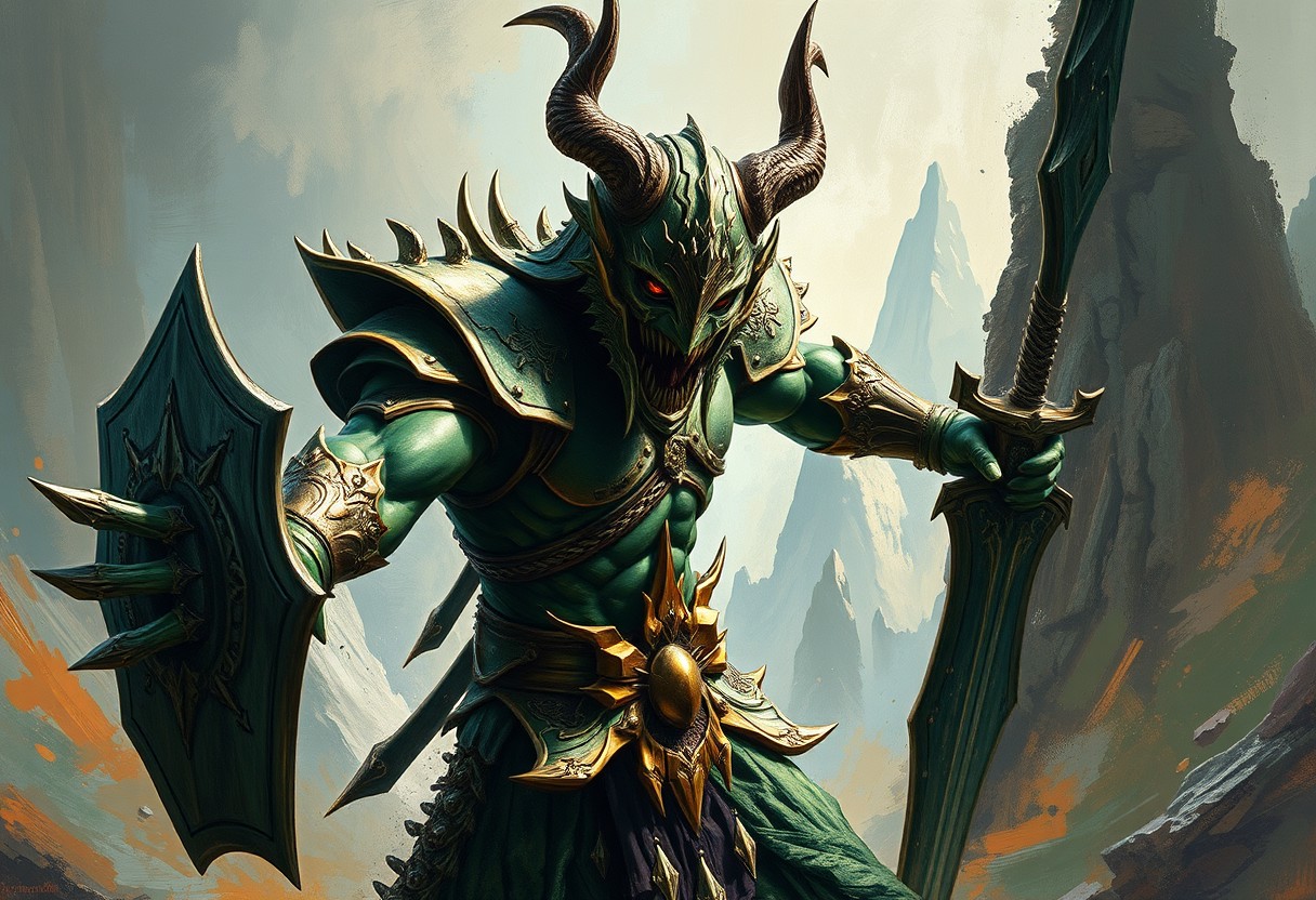 Surrealist oil painting of the hyper detailed action Berserkion the Electromagna Warrior from the video game "Dark Souls", depicted in a dynamic, almost distorted pose, left arm with shield reaching towards the viewer, right arm with sword poised. The character is rendered in rich green and gold textures, with intricate armor and a large horned helmet. The background is a dreamlike, abstract interpretation of a War Rock Mountain, rendered with thick, expressive Brush Strokes. Captivating Lighting casts dramatic shadows. High-res, 4K, Exceptional Quality, More Detail, Handcrafted with Precision, High Quality, Stunning Colors, Harmonious Colors, Multi Colored, Contemporary Aesthetics, Impeccable Composition, Creative Angle, Attractive Background, Balanced Editing, Intentional Focus. Elements suggestive of Grammer Effect Style, Splash Ink Illustration, Octane Render gloss, Unreal Engine 5 texture detail. Inspired by Raphael Style dynamism and Houdini Style complexity. Beautiful Detailed Eyes peek from the helmet. Conveying Vivid Emotions, Joyful Impact, Powerful Message through symbolic imagery. CGSociety, Artstation Trending on ArtstationHQ, Golden Ratio., very detailed.