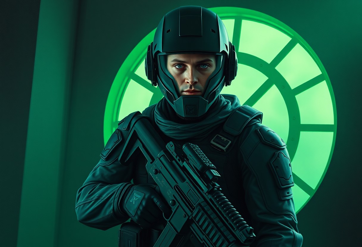 A Surreal Oil Painting of a futuristic soldier, standing in a dimly lit room. The soldier is equipped with a helmet and a gun, suggesting readiness for combat, Super Detailed Face and Eyes and Clothes, Beautiful Detailed Eyes, Lifelike Details. The room is characterized by a large circular window in the background, which is illuminated by a green light, casting an ethereal glow on the soldier, Captivating Lighting. The soldier's position in front of the window and the green light create a sense of depth in the image, Attractive Background. The overall color scheme is dominated by shades of green and gray, Stunning Colors, Harmonious Colors, Multi Colored. adding to the futuristic and mysterious atmosphere. 4K, 4K, Exceptional Quality, More Detail, Handcrafted with Precision, High Quality, Sharp Lines and Brush Strokes, Contemporary Aesthetics, Beautiful Matte Painting, Impeccable Composition, Creative Angle, Balanced Editing, Intentional Focus, Well-timed Moment, Isometric, Dynamic Action Pose, Grammer Effect Style, Splash Ink Illustration, Octane Render, Octane Render, Unreal Engine 5, Raphael Style, Houdini Style, Vivid Emotions, Joyful Impact, Powerful Message, CGSociety, Artstation Trending on ArtstationHQ, Golden Ratio, trending on artstation, concept art, detailed, detailed, high definition, sharp focus, insane detail, volumetric lighting, very detailed.