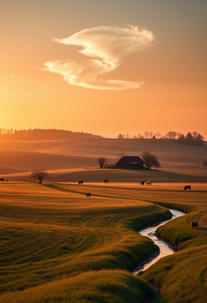 A breathtaking rural scene shot with a Sony A7III using a wide-angle lens, featuring expansive open fields glowing under a pastel sunset sky. The colors range from soft amber to faded mauve, casting a serene light across the land. In the distance, a quaint wooden farmhouse with a red roof is cradled by tree-lined hills. Livestock graze peacefully, their forms blending into the land’s gentle undulations. A narrow stream glistens, winding like a ribbon of light. Hidden within the shadows of trees and the lines of the hills are faintly visible faces, owls, and other enchanted forms, revealed only with focused gaze. The clouds in the sky swirl subtly into the shape of a galloping horse. The image masterfully balances realism with delicate fantasy, inviting the viewer into a world of peaceful illusion and rural charm.