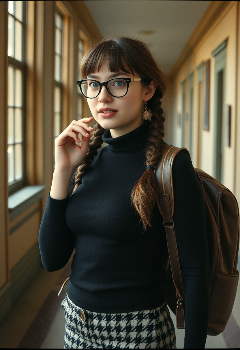 score_9, score_8_up, score_7_up, (realistic:2) , analog film photo ,faded film, desaturated, 120mm film, Hasselblad Camera, grainy, vignette, vintage, vintage color film, Lomography, stained, highly detailed, contact print with visible black film border:0.8, beautiful , masterpiece, thighs up photo, Nerdy 21 year old woman, college girl, nervous, timid, looking slightly to the side, cute round face:0.8, pale white skin, light freckles:0.7, big blue eyes, black rimmed glasses, long shiny brown hair in twin braids with bangs, full pouty lips:0.8, lips parted:0.8, teeth visible, naturally red lips, medium firm round breasts:0.8, petite body, wide hips, skinny:0.9, tight black turtleneck sweater stretched tight over her breasts:0.9, knee length black and white houndstooth pencil skirt:0.8, worn leather backpack slung over one shoulder, adjusting her glasses with one hand, walking through hallway of old college, beautiful side lighting from large windows,