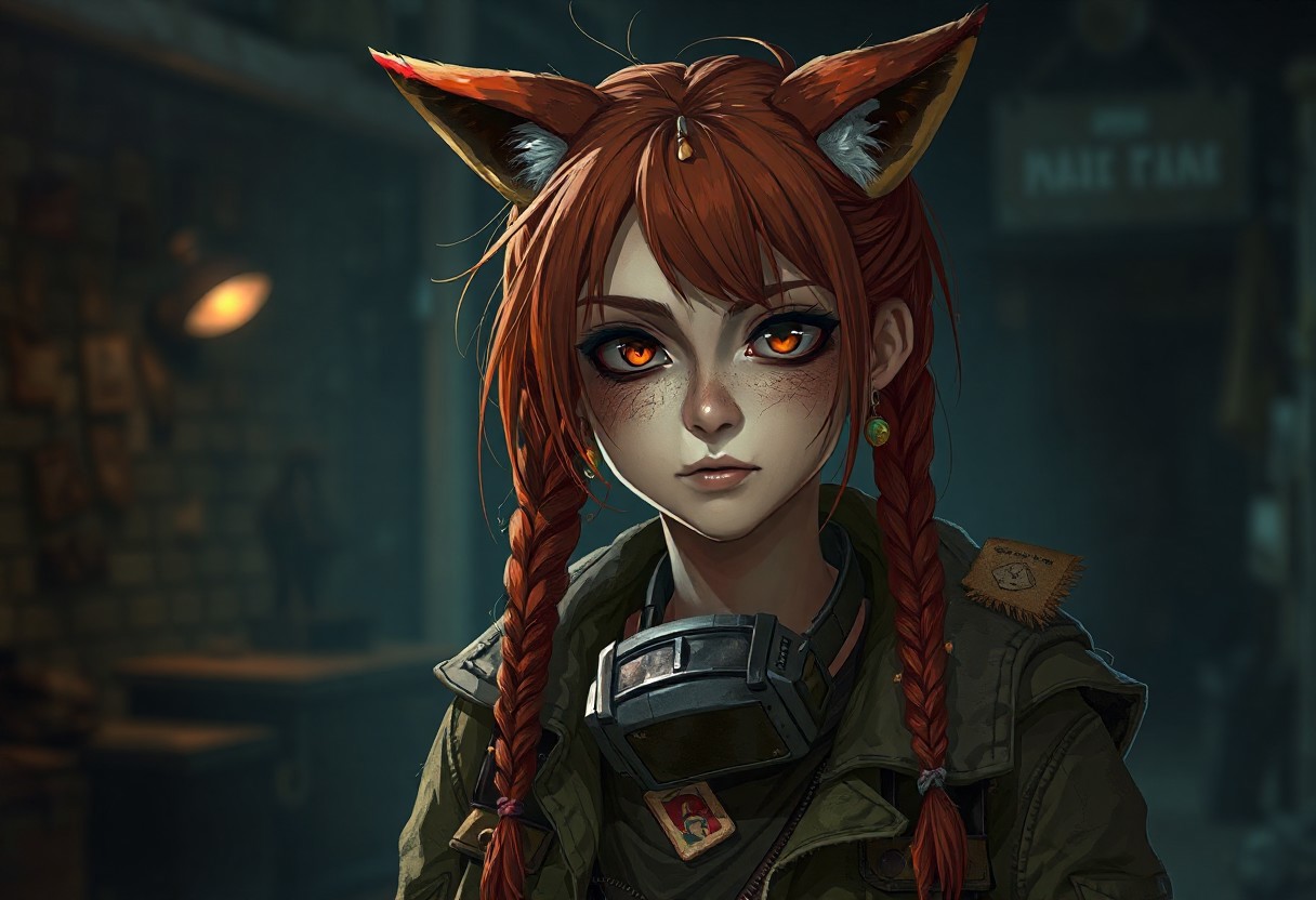 Create an image of a character named Foxy, a young woman with a rugged and resilient appearance, reflecting her life in a post-apocalyptic world. She has red hair styled in braids, with a few colorful beads woven in. Her face shows signs of wear and determination, with a notable absence of pupils in her eyes, giving her a unique and somewhat eerie look. She wears practical, worn-out clothing suitable for survival, including a jacket and goggles around her neck. The background should depict a dimly lit, post-apocalyptic environment, emphasizing the harsh and unpredictable nature of her surroundings. Foxy is often seen talking to her pet rat, Bunny, which only she can see, adding a touch of mystery to her character. The lighting should be dramatic, highlighting her unique features and the stark reality of her world.