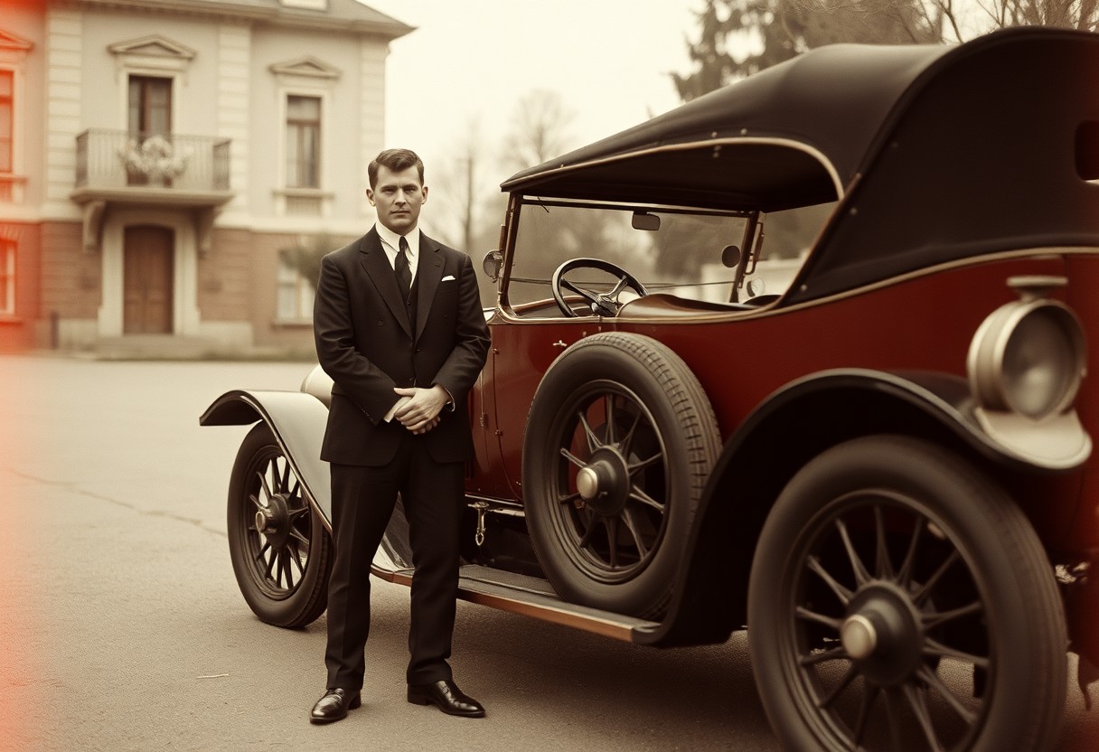 A sharply dressed man from the early 1900s poses beside a grand touring car, its body long, elegant, and punctuated by intricate metalwork. His expression is confident yet reserved, hands gently clasped, one foot resting on the car’s running board. The atmosphere is one of poised silence, captured through the lens of aged analogue film. Every visual detail is textured—soft grain weaves through the frame, light leaks bleed faint gold from the corner, and slight blur keeps nothing too sharp, too modern. The palette whispers of time: dusty grays, warm browns, hints of copper. The building and trees in the background fade into softened bokeh, as if time has eroded their edges. Faint scratches trace the image like scars, while subtle vignetting embraces the scene in a slow cinematic pull. It's less a photograph and more a ghostly moment made visible—tactile, imperfect, deeply human.