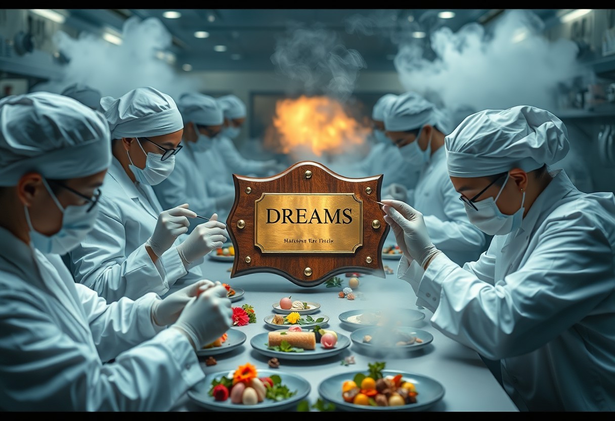 A busy kitchen full of workers in clean white coats, they are working on details of a wooden award plaque that has a brass plate with the word "DREAMS" engraved on it. The workers are using small utensils like tweezers, small knives, and plating spoons. They are arranging tiny flowers and exotic foods. There is a dreamlike feel, atmospheric, rays of light, glowing clouds of steam in the background. No masks, no gloves. wearing toques.