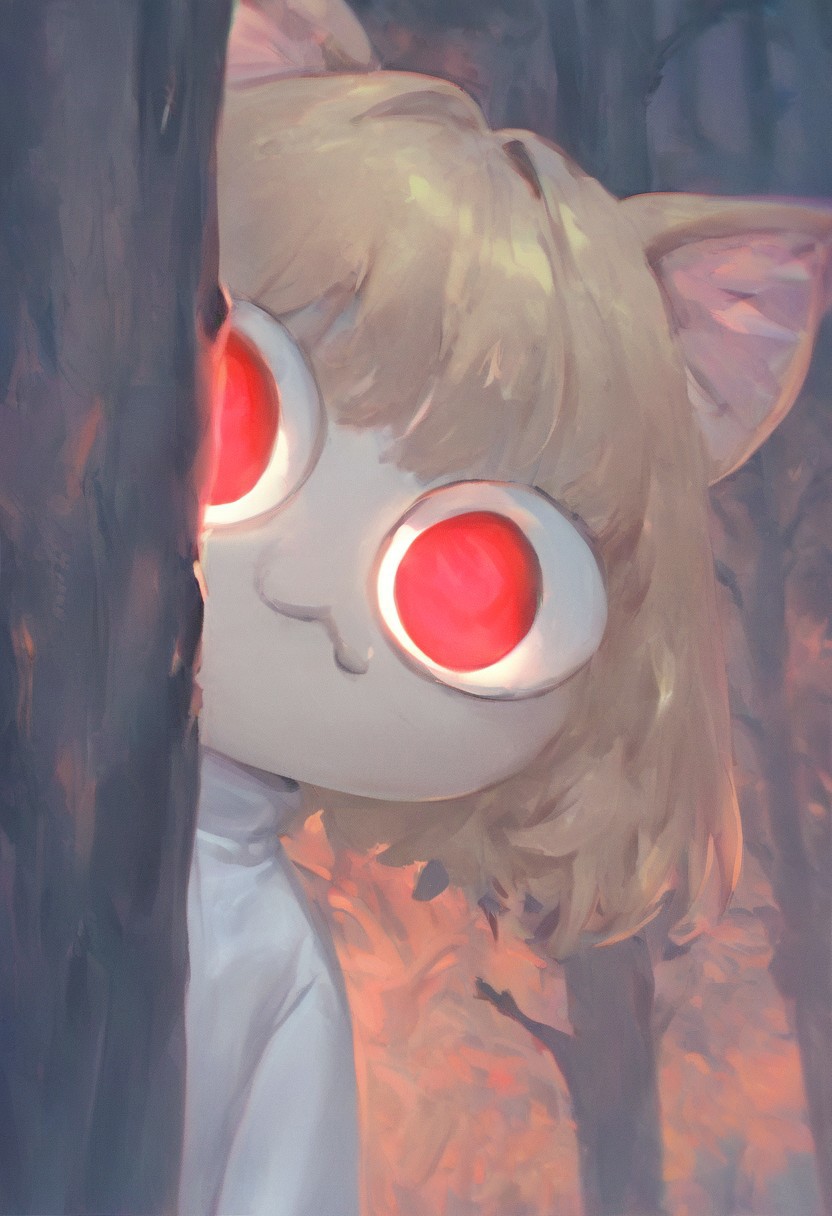 score_9, score_8_up, score_7_up, solo, peeking out, upper body, hiding behind tree, night, horror \(theme\), forest, necoarc, glowing eyes, cat ears, blonde hair, red eyes, chibi, :3, white shirt, turtleneck, looking at viewer, (cute:1.2)
