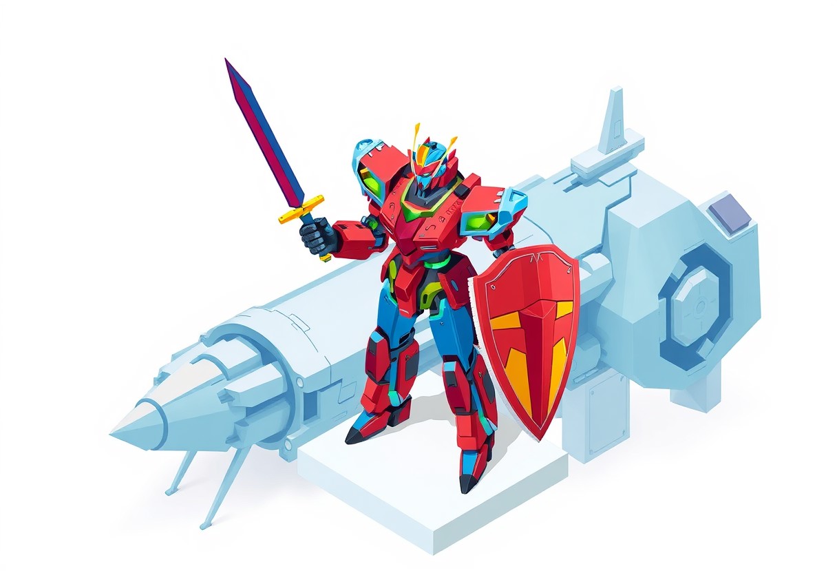 Stylized graphic illustration in Grammer Effect and Splash Ink styles, focusing on a Cyber Angel Natasha robot as the main subject. The robot, a complex and vibrant entity of red, blue, green, and yellow, is positioned centrally, standing on a white surface. It holds a sword in its right hand and a shield in its left, depicted with graphic boldness. A crown is clearly visible on its head. The background features the geometric and complex shapes of Fortissimo the Mobile Fortress, rendered with a unique Houdini-style approach, creating a striking and attractive contrast. The composition is isometric and impeccable, with a creative angle and intentional focus on the robot. The colors are stunning and harmonious, presented in a multi-colored, contemporary aesthetic. The overall piece is high-quality and trending on ArtstationHQ, utilizing the Golden Ratio for visual balance. No discernible texts or other objects are included, allowing the focus to remain solely on the stylized robot and its dramatic background.