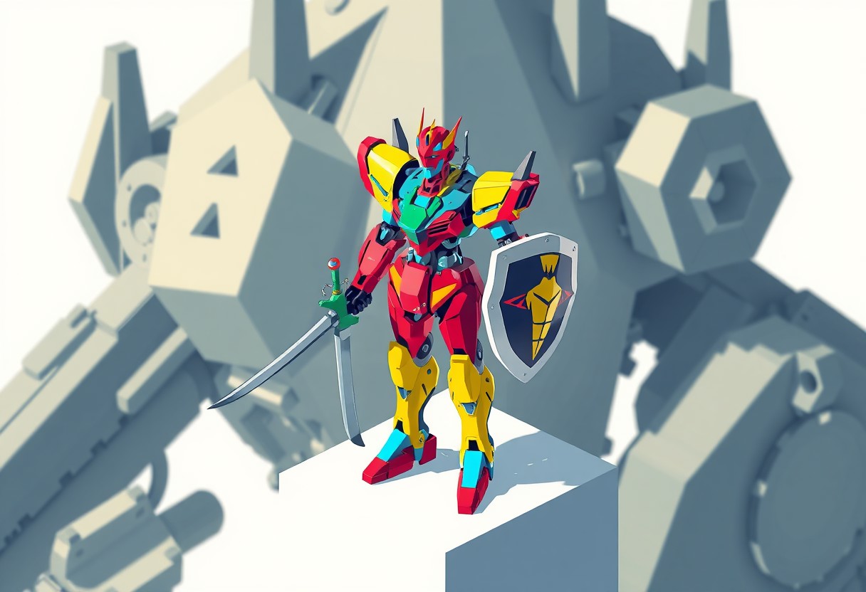 Stylized graphic illustration in Grammer Effect and Splash Ink styles, focusing on a Cyber Angel Natasha robot as the main subject. The robot, a complex and vibrant entity of red, blue, green, and yellow, is positioned centrally, standing on a white surface. It holds a sword in its right hand and a shield in its left, depicted with graphic boldness. A crown is clearly visible on its head. The background features the geometric and complex shapes of Fortissimo the Mobile Fortress, rendered with a unique Houdini-style approach, creating a striking and attractive contrast. The composition is isometric and impeccable, with a creative angle and intentional focus on the robot. The colors are stunning and harmonious, presented in a multi-colored, contemporary aesthetic. The overall piece is high-quality and trending on ArtstationHQ, utilizing the Golden Ratio for visual balance. No discernible texts or other objects are included, allowing the focus to remain solely on the stylized robot and its dramatic background.