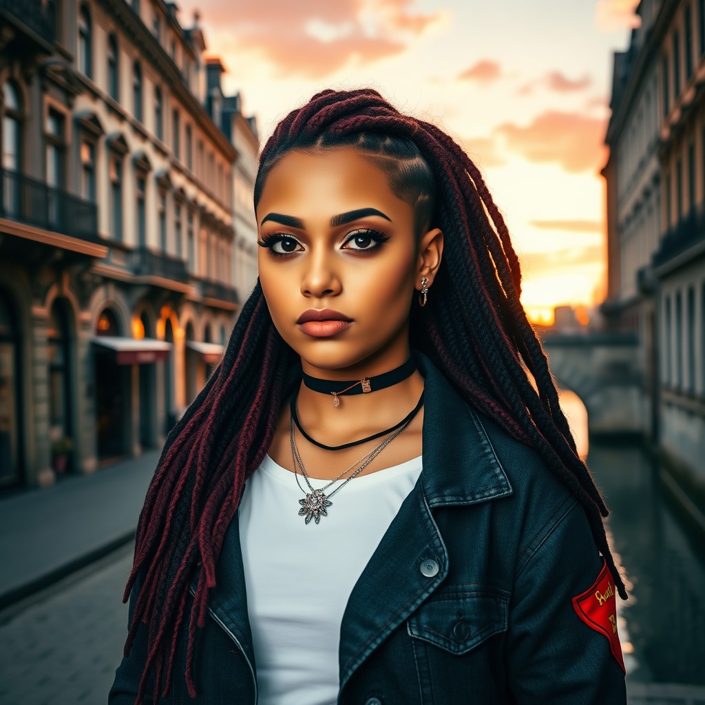 A young woman with a confident expression, standing on a European city canal street during sunset. She has a distinctive hairstyle with long, thick dreadlocks in shades of deep red, black, and hints of purple, styled with some shaved sides. Her makeup is bold with dark eyeliner, voluminous lashes, and subtle nude lips. She has a tattoo of a floral design on her neck, and her ears are pierced with sparkling earrings. She wears a black choker with a red accent, layered necklaces, and a casual dark denim jacket with a red patch on the sleeve, over a white top. The background features historic European buildings with ornate facades, arched windows, and decorative moldings, a canal reflecting the warm glow of the setting sun, and a stone bridge in the distance. The sky is painted with soft pastel hues of pink, orange, and purple, with a few scattered clouds. The lighting is warm and golden, casting gentle shadows and highlighting her features and the textures of her hair and clothing. The overall style is a blend of modern fashion and urban streetwear with a romantic, cinematic atmosphere.