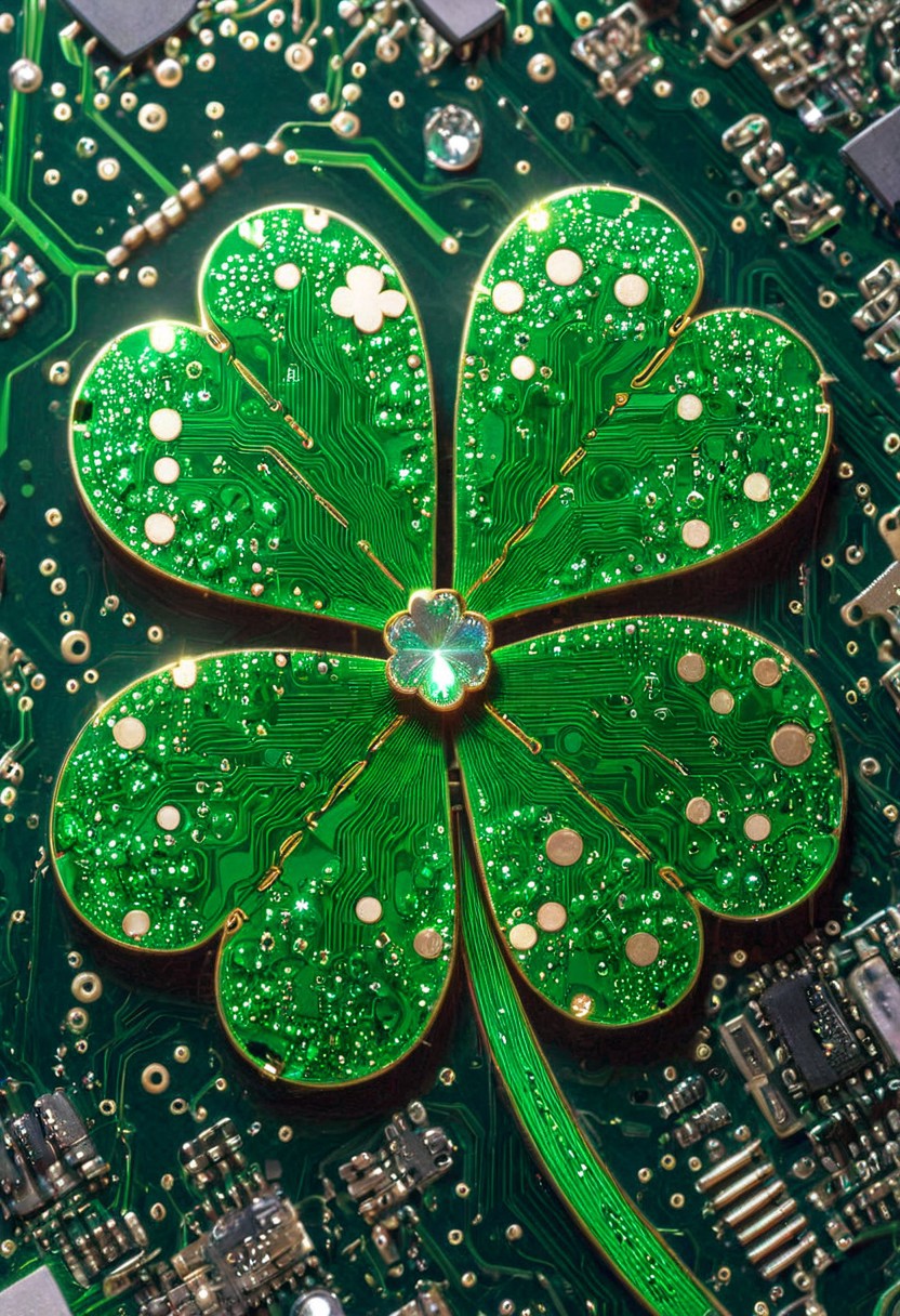 close up of clover circuit board, iridescent, (pcb woven design:1.1), cosmic, ShamrockWorld, clover, four-leaf clover, light particles, bow, striped, bowtie, green gems, reflection, close-up, cyberpunk