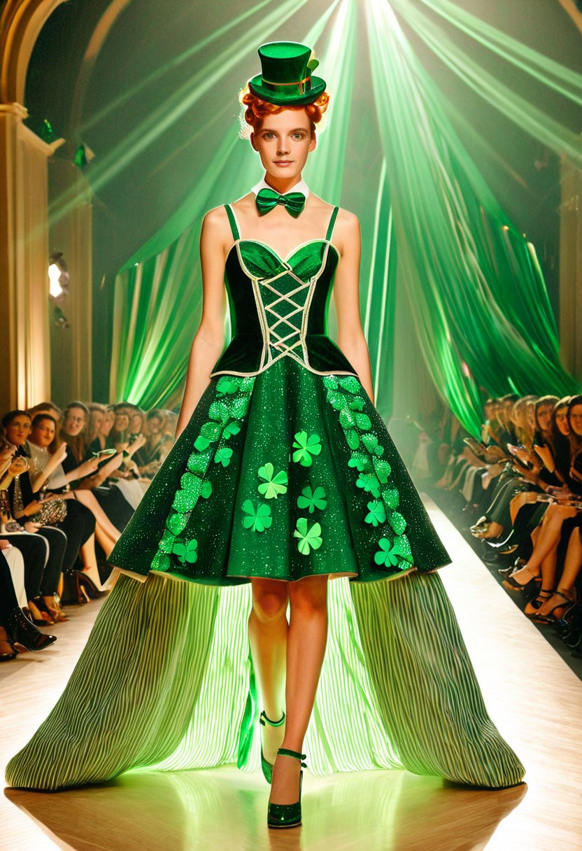 a model on a catwalk, Avant-garde Fashion page, wearing an elegant Celtic gown, sculptural dress, colourful, folded dress, (swirling:0.3), sculptural clover top hat, Soft and warm lighting, cozy atmosphere, fashion show, ShamrockWorld, clover, four-leaf clover, light particles, bow, striped, bowtie, green gems, 35mm photograph, film, professional, 4k, highly detailed, Masterpiece, elegant design, an award winning, intricate details, iconic, vintage RAW photo, photorealistic, film grain, candid camera, color graded cinematic, atmospheric lighting, natural, shallow dof, focusing on lighting, realistic textures, hyperdetailed, SFW, product photo,