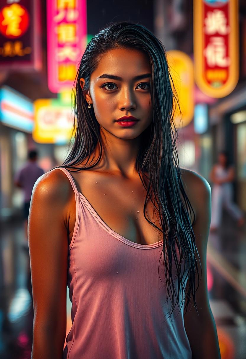 A beautiful young woman with long wet hair, standing in the rain at night in a vibrant city street. She is wearing a light pink sleeveless top made of thin, transparent fabric. Water droplets are visible on her skin and hair. The background is softly blurred with colorful bokeh from neon signs and street lights. Her expression is calm and slightly melancholic. Cinematic lighting,