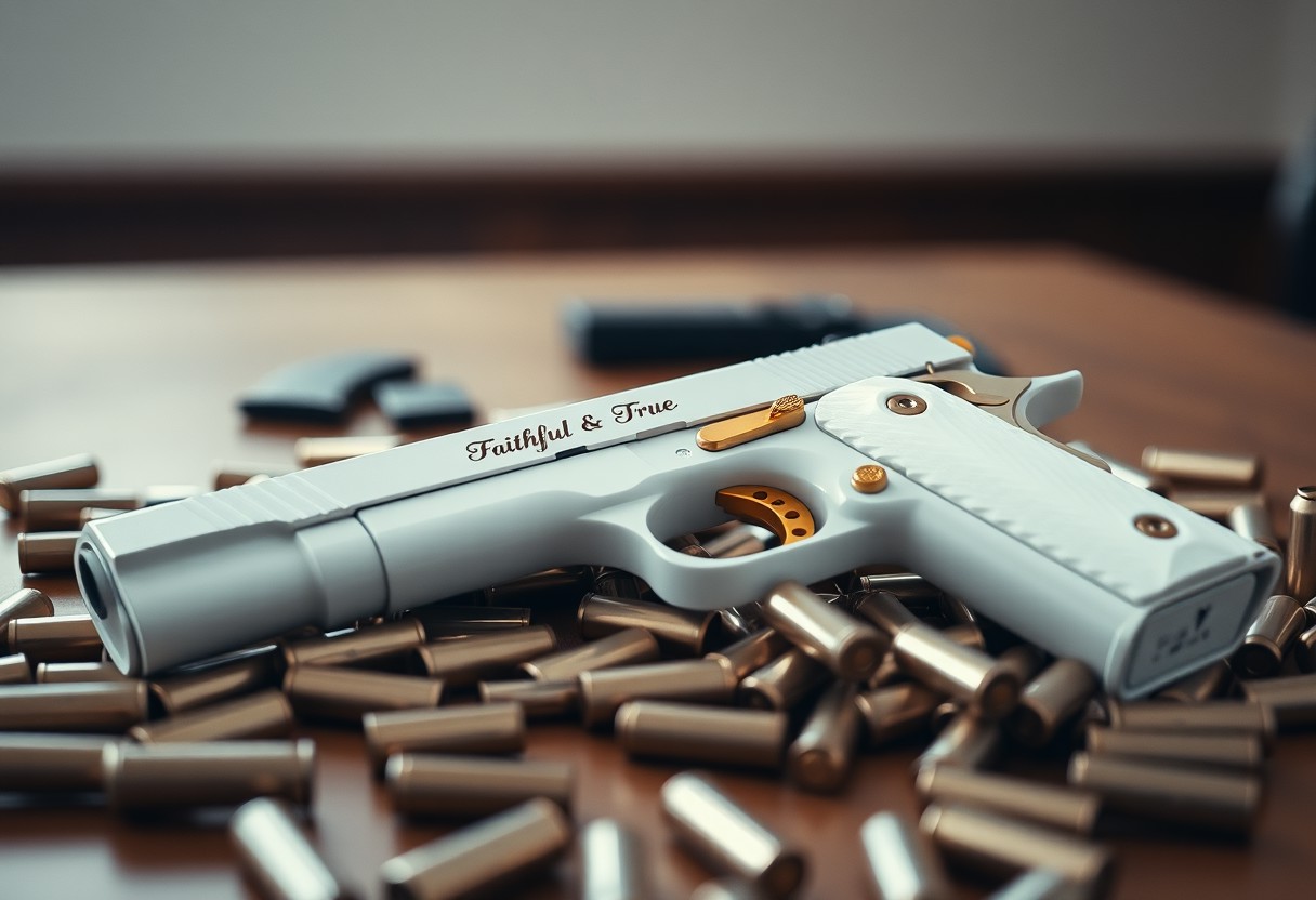 A gun is lying flat on a wooden table, it is a pure white ((Colt 1911)) full-size handgun with "Faithful & True" engraved in elegant font along the slide of the pistol. The grips are beautiful pearl white, and the the gun has gold accents on all the buttons and levers. The pistol is surrounded by spare mags and dozens of extra .45 ACP ammunition rounds littered across the table. weapon, indoors, signature, blurry, gun, no humans, depth of field, blurry background, handgun, action film style, shallow depth of field, vignette, highly detailed, high budget, bokeh, cinemascope, moody, epic, gorgeous, film grain, grainy