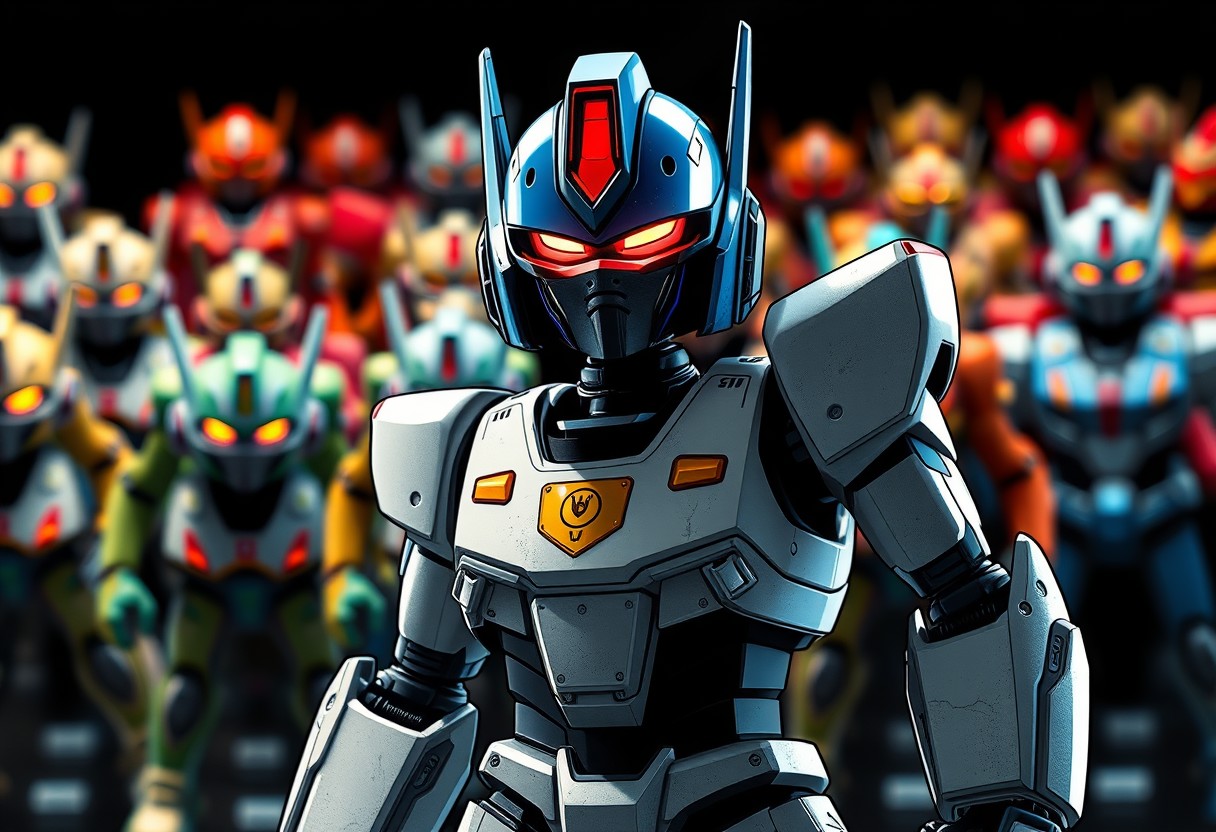 An intense, super detailed graphic novel illustration in a dynamic action pose features a central, powerful robot figurine. The robot, boasting a deep blue head with a glowing red visor and a crisp white body with a prominent gold emblem on its chest, is rendered with sharp lines and bold brush strokes, exuding a contemporary aesthetic. A Grammer Effect style and subtle splash ink elements enhance its futuristic design. It stands silhouetted against a stark black background, where other blurred, multi-colored robot figurines create an attractive, expansive collection display. The impeccable composition employs a creative angle, drawing the eye directly to the robot's vivid emotions and powerful message. Stunning, harmonious colors and captivating lighting define this high-quality, handcrafted piece. Trending on ArtstationHQ, CGSociety quality.