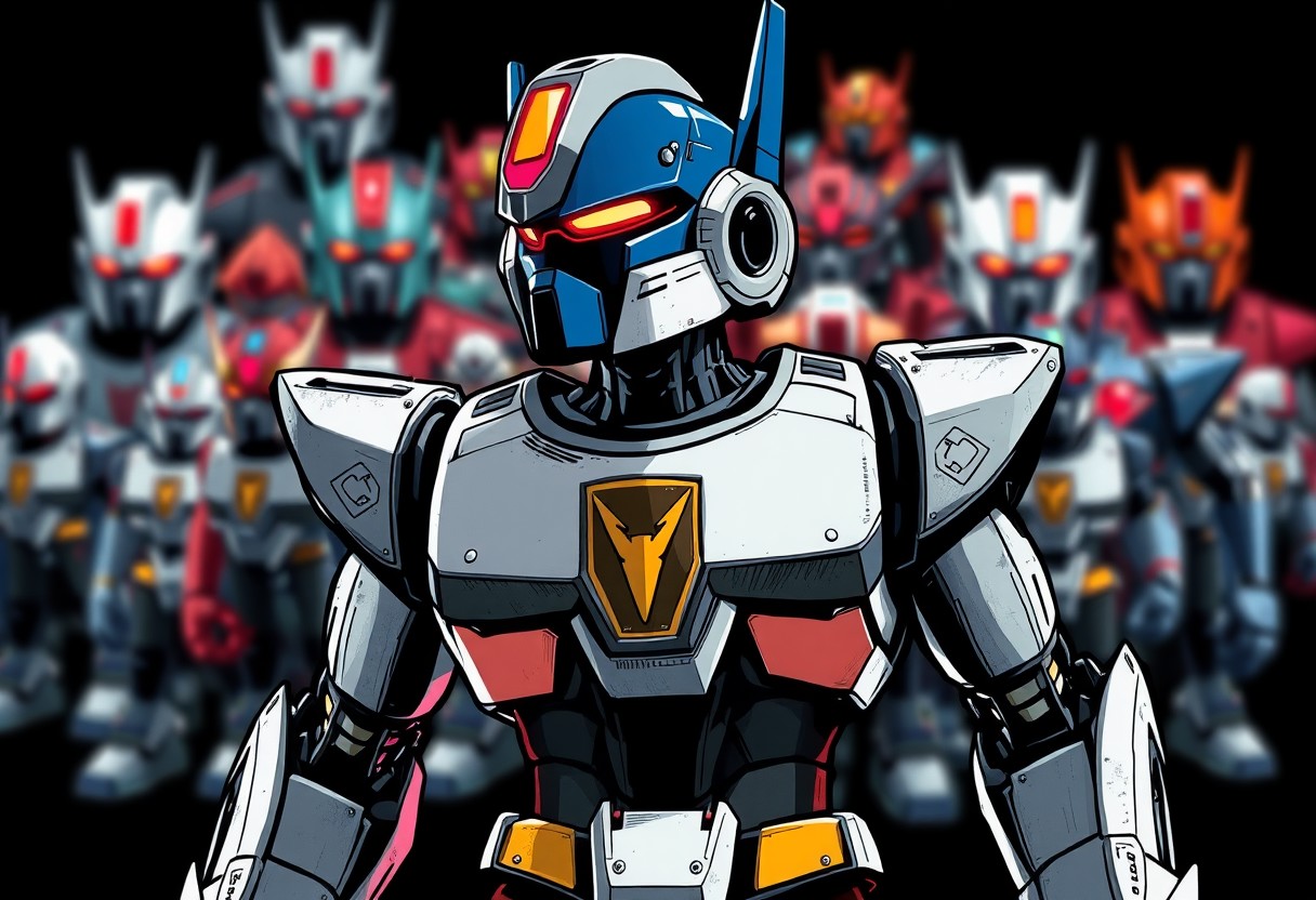 An intense, super detailed graphic novel illustration in a dynamic action pose features a central, powerful robot figurine. The robot, boasting a deep blue head with a glowing red visor and a crisp white body with a prominent gold emblem on its chest, is rendered with sharp lines and bold brush strokes, exuding a contemporary aesthetic. A Grammer Effect style and subtle splash ink elements enhance its futuristic design. It stands silhouetted against a stark black background, where other blurred, multi-colored robot figurines create an attractive, expansive collection display. The impeccable composition employs a creative angle, drawing the eye directly to the robot's vivid emotions and powerful message. Stunning, harmonious colors and captivating lighting define this high-quality, handcrafted piece. Trending on ArtstationHQ, CGSociety quality.