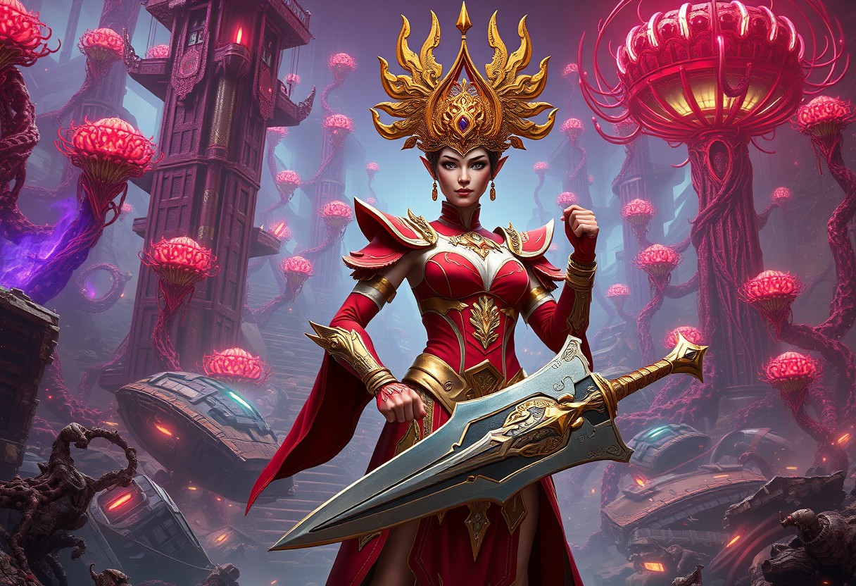 An epic, award-winning digital painting of the Female Lilith, Lady of Lament, rendered with meticulous detail in the style of Unreal Engine 5 and Octane Render. She stands as the central, dominant figure within a sprawling, fantastical scrapyard, reimagined as a monument of forgotten civilizations. Her vibrant red and gold outfit and matching elaborate headpiece are depicted with incredible artistic brush strokes and sharp lines, showing every stitch and embellishment. Her large, ornate sword is held firmly in her right hand, gleaming with magical energy, while her left hand rests defiantly on her hip. The background is a breathtaking matte painting, featuring towering structures of salvaged tech and gnarled metallic flora, bathed in captivating, multi-colored neon-like lighting. The composition boasts a dynamic action pose from an isometric perspective, highlighting her powerful, creative angle. Super detailed face and eyes radiating vivid emotions and a joyful impact, handcrafted with precision. 4K, impeccable composition, stunning harmonious colors, contemporary aesthetics, CGSociety, trending on ArtstationHQ.