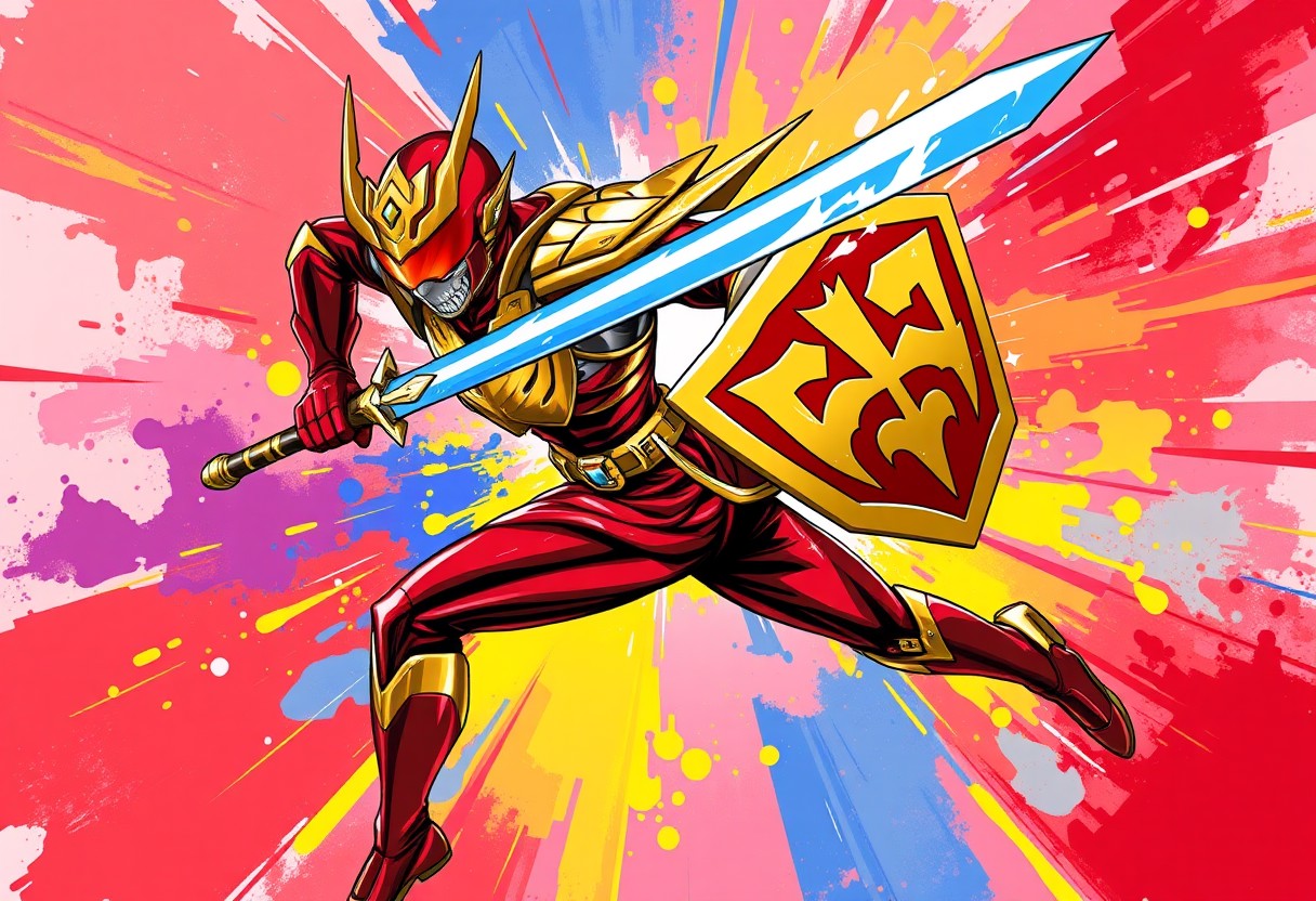 A powerful, dynamic action pose of the Noble Knight's Spearholder from the popular Japanese anime "Kamen Rider", depicted in a vibrant splash ink illustration style. The Spearholder, in their iconic red and gold outfit, gold helmet with red visor, and a prominent gold emblem, is mid-stride, brandishing a striking blue and gold sword in their right hand and a matching shield in their left. The image is explosive with motion, featuring sharp lines and expressive brush strokes. Grammer Effect Style elements create energetic trails and impactful visual effects around the sword and shield. The background is an abstract, multi-colored burst of complementary hues, suggesting a powerful, well-timed moment of confrontation. Vivid emotions radiate from the pose, embodying a joyful impact and powerful message. High quality, super detailed clothes and weaponry, impeccable composition, CGSociety quality, trending on Artstation.