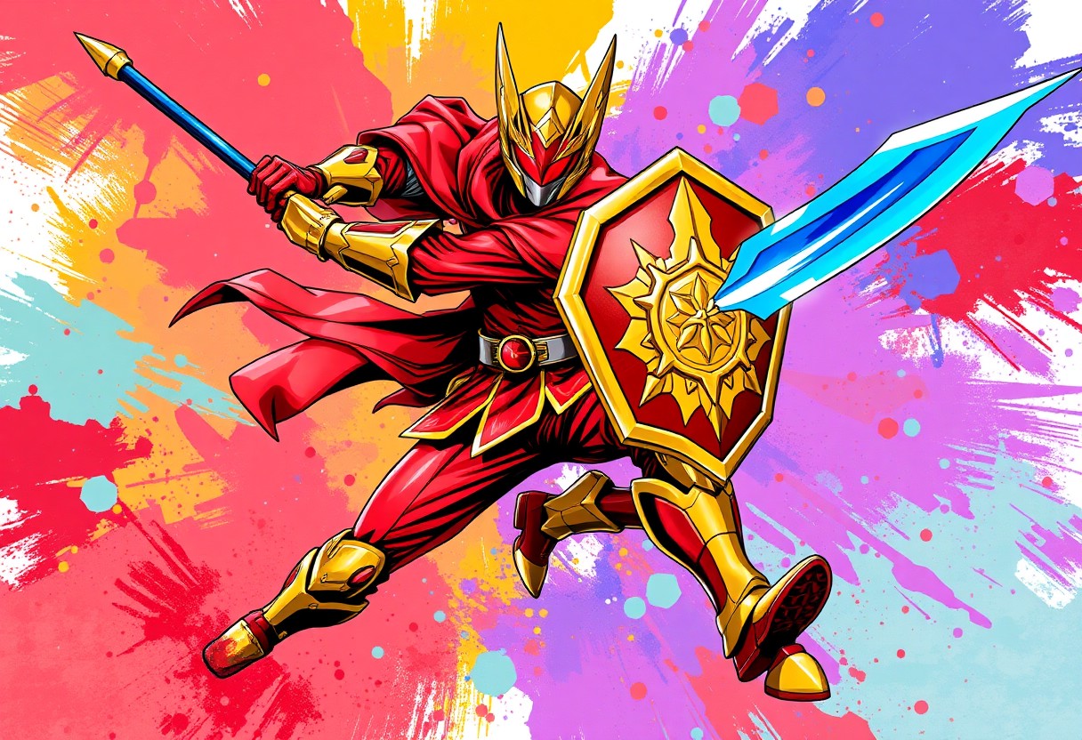A powerful, dynamic action pose of the Noble Knight's Spearholder from the popular Japanese anime "Kamen Rider", depicted in a vibrant splash ink illustration style. The Spearholder, in their iconic red and gold outfit, gold helmet with red visor, and a prominent gold emblem, is mid-stride, brandishing a striking blue and gold sword in their right hand and a matching shield in their left. The image is explosive with motion, featuring sharp lines and expressive brush strokes. Grammer Effect Style elements create energetic trails and impactful visual effects around the sword and shield. The background is an abstract, multi-colored burst of complementary hues, suggesting a powerful, well-timed moment of confrontation. Vivid emotions radiate from the pose, embodying a joyful impact and powerful message. High quality, super detailed clothes and weaponry, impeccable composition, CGSociety quality, trending on Artstation.