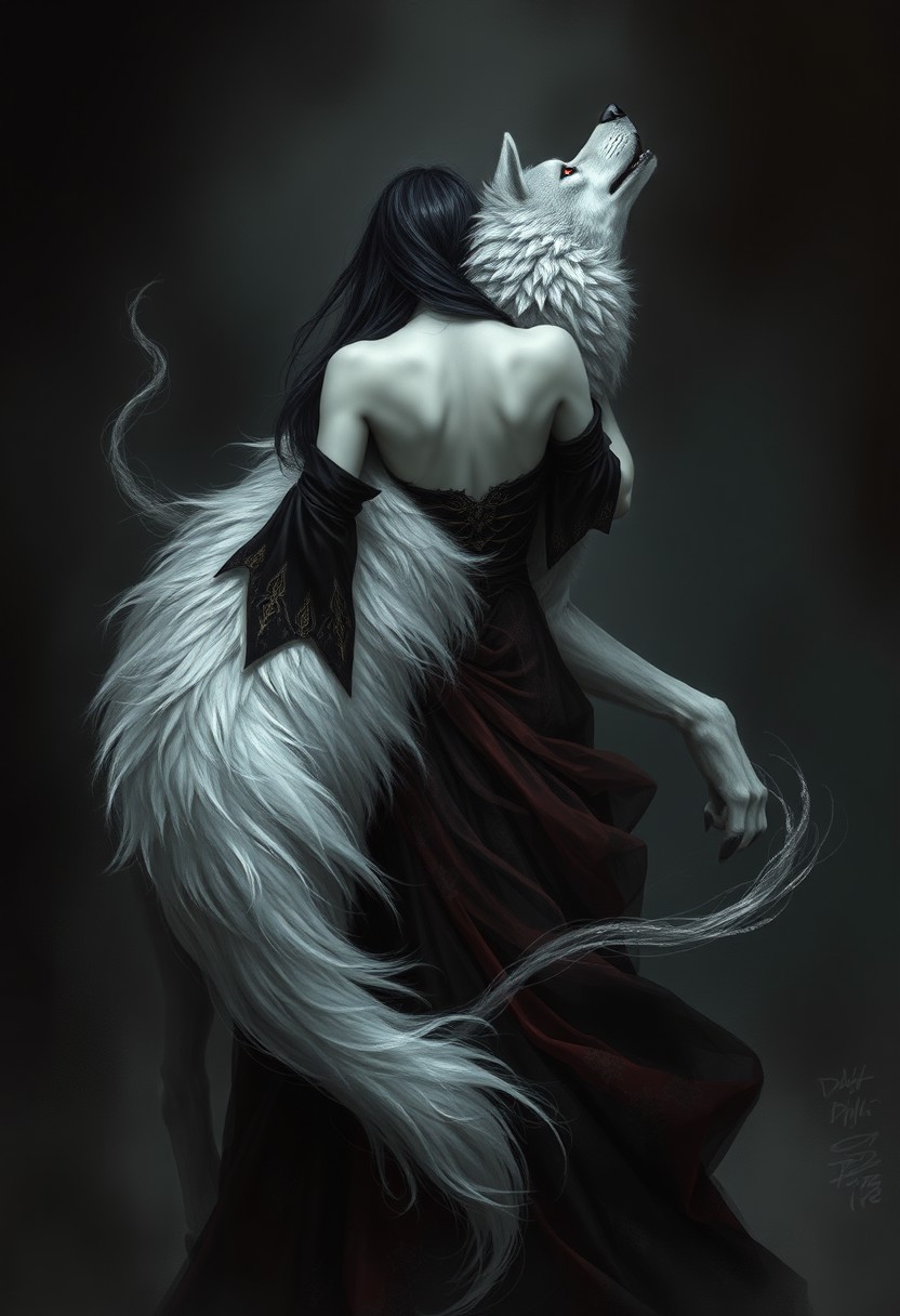 Monochrome, black and white photo, a digital painting featuring a mystical and haunting scene. At the center is a young woman with pale skin and long, dark hair, dressed in a flowing black and red dress adorned with gold accents. Her back is to the viewer, and she appears to be embracing a large, ethereal wolf. The wolf's fur is predominantly white, with hints of gray, and it has piercing red eyes that seem to glow ominously. The wolf's fur is rendered in a way that suggests movement, with wisps and tendrils swirling around the woman and the wolf. The background is dark and shadowy, with subtle hints of a misty or smoky atmosphere that adds to the mystical and otherworldly feel of the image. The overall color palette is dominated by dark tones with occasional highlights of white and gold, creating a dramatic and surreal effect. The style of the painting is highly detailed and realistic, with a focus on texture and movement, giving it a lifelike yet fantastical quality. The woman's dress and the wolf's fur are rendered with intricate detail, emphasizing the contrast between the delicate human form and the wild, untamed nature of the wolf.