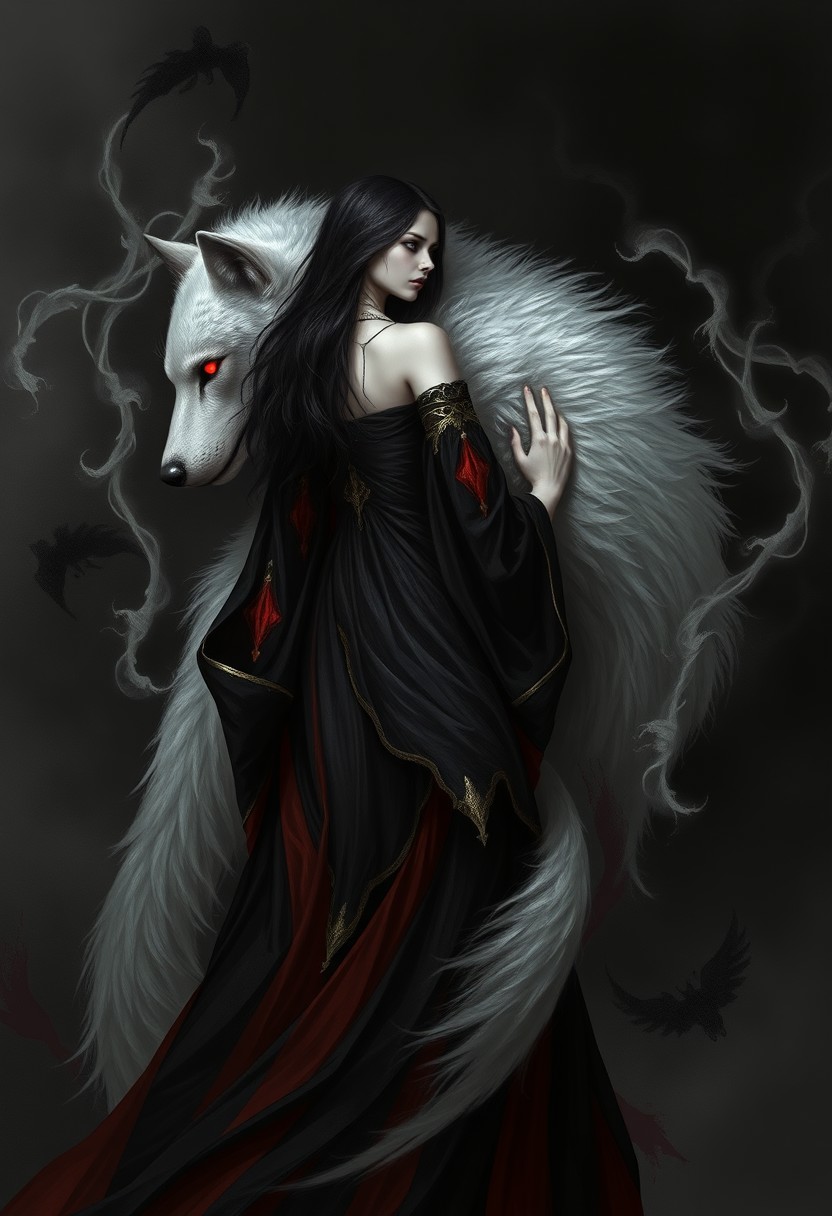 Monochrome, black and white photo, a digital painting featuring a mystical and haunting scene. At the center is a young woman with pale skin and long, dark hair, dressed in a flowing black and red dress adorned with gold accents. Her back is to the viewer, and she appears to be embracing a large, ethereal wolf. The wolf's fur is predominantly white, with hints of gray, and it has piercing red eyes that seem to glow ominously. The wolf's fur is rendered in a way that suggests movement, with wisps and tendrils swirling around the woman and the wolf. The background is dark and shadowy, with subtle hints of a misty or smoky atmosphere that adds to the mystical and otherworldly feel of the image. The overall color palette is dominated by dark tones with occasional highlights of white and gold, creating a dramatic and surreal effect. The style of the painting is highly detailed and realistic, with a focus on texture and movement, giving it a lifelike yet fantastical quality. The woman's dress and the wolf's fur are rendered with intricate detail, emphasizing the contrast between the delicate human form and the wild, untamed nature of the wolf.