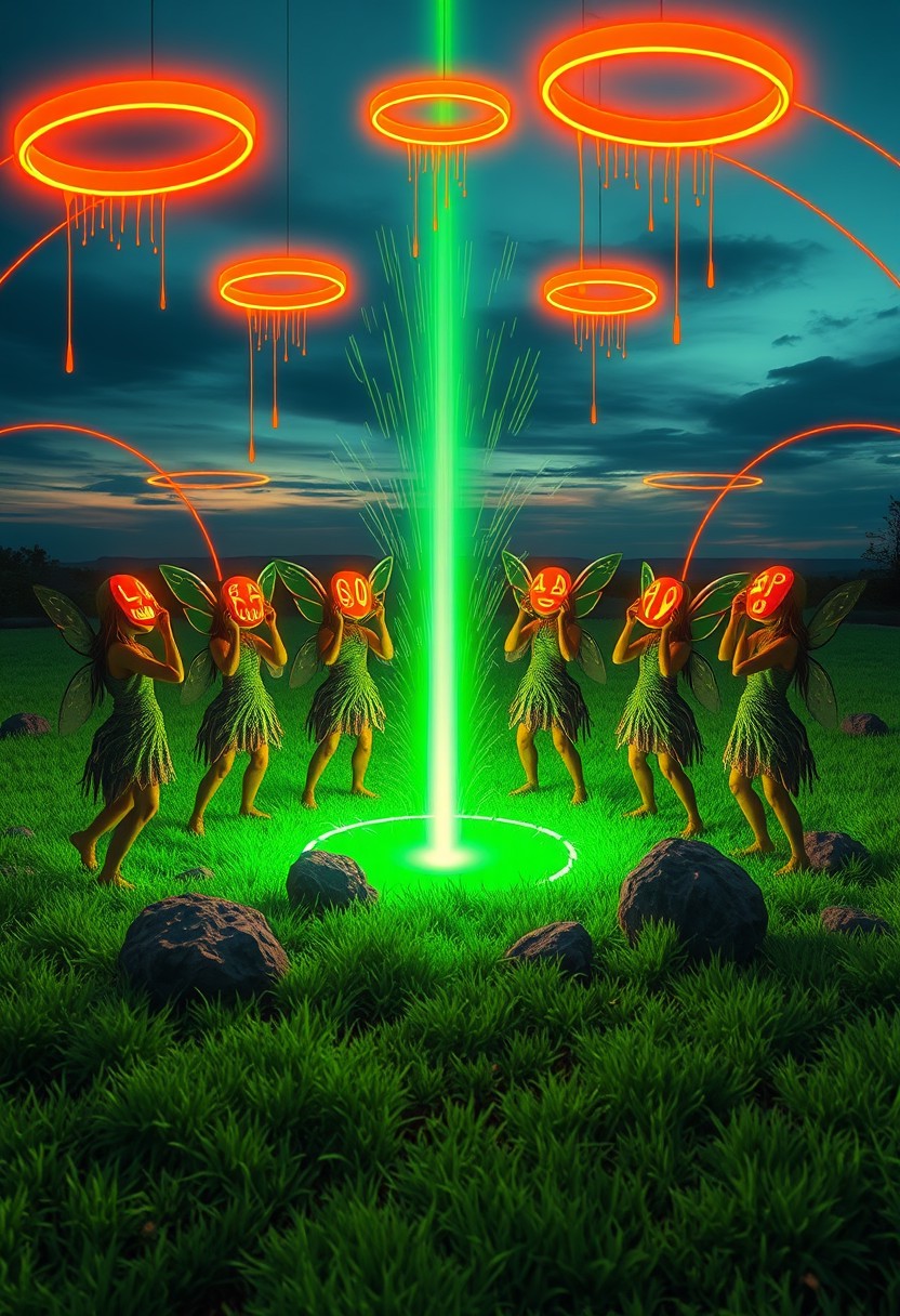 A magical ritual unfolds at twilight, as a small coven of fairy-like beings gathers in a circle etched into glowing neon green grass. Each figure holds a mask shaped like a stylized comic icon—bold zigzags, lightning bolts, and exclamation points—glowing in bright orange as they raise them toward the sky. Above, floating neon orange rings pulse and descend, casting light over their bodies textured with moss, fur, and sculpted clay. The ritual space is bordered by arching comic-panel dividers, framing the event in pop surrealism. From the center of the circle, a beam of green energy erupts, traced in stylized vector lines and halftone dots. Every surface in the scene—from skin to stones—reflects or absorbs the electric green and orange light, making the landscape appear both otherworldly and handmade. The color dominates, bleeding into every texture and surface, overwhelming reality in a spectacle of synthetic glow and ancient fantasy.
