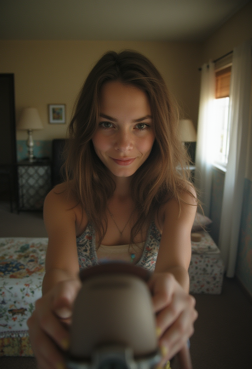 Amateur selfie of a girl on her bedroom. Casual, f/8, noise, slight overexposure, crowded scene, jpeg artifacts, on flickr in 2007, 2005 blog, 2007 blog