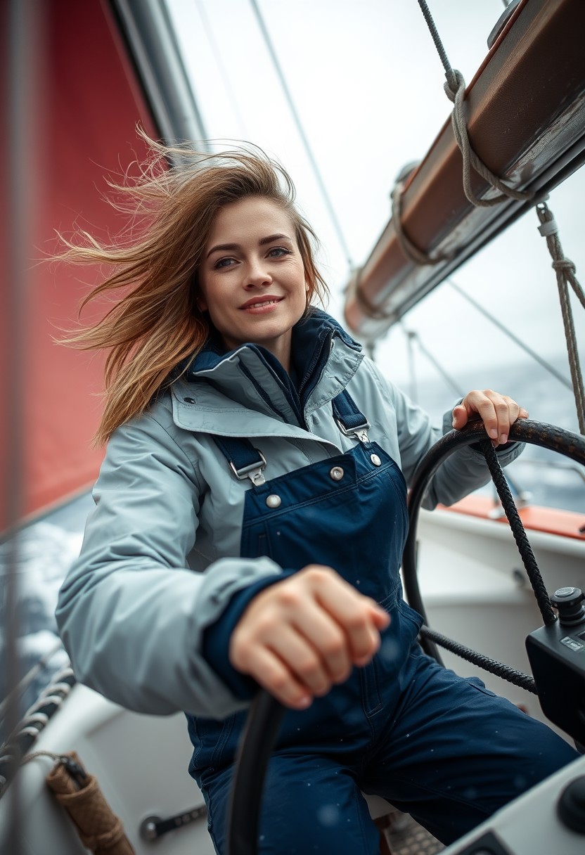 beautiful woman steering sailing yacht in heavy seas, rain jacket, overalls, hair blowing, close up