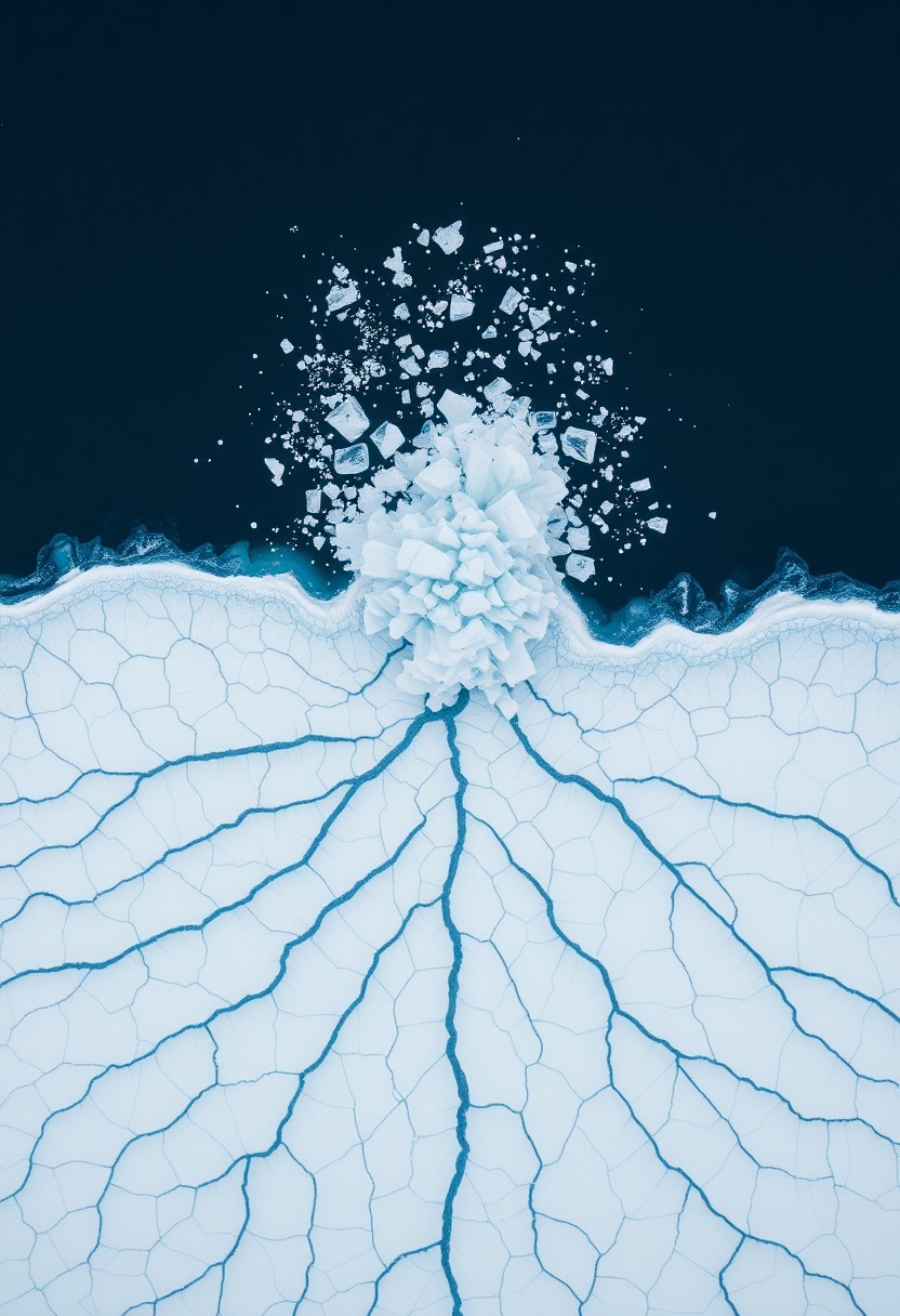 This striking aerial perspective captures a dynamic interplay between ice and water. The foreground is dominated by a textured expanse of what appears to be a glacial surface or a vast sheet of ice, characterized by intricate, almost woven patterns of blue lines and cracks against a white backdrop. These lines create a sense of depth and movement, suggesting the immense pressures and forces that shape these frozen landscapes. Above this icy foundation, a dramatic burst of fragmented ice and water erupts from the center, reminiscent of an explosion or a powerful gush. The darker blue background, likely deep water, provides a stark contrast, highlighting the bright, scattered pieces of ice that fan out from the central disturbance. The overall impression is one of raw natural power and the captivating beauty of polar environments. The image evokes feelings of both awe and the fragile grandeur of our planet's icy regions.features asymmetrical cuts and high-tech elements like embedded LEDs that pulse softly