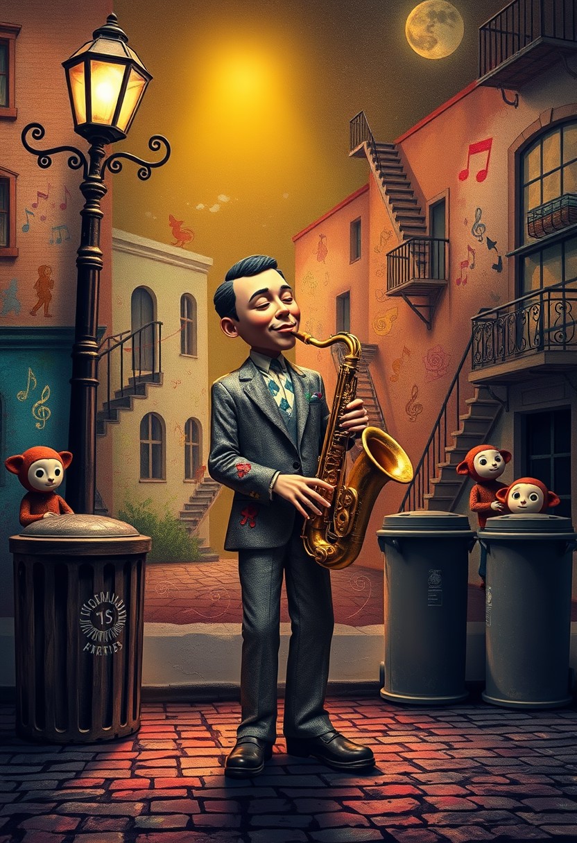 A jazz musician stands center stage beneath a glowing vintage streetlamp, surrounded by a dreamlike cityscape painted with surreal detail. His body is stylized and slightly elongated, with a smooth sculpted face that features closed eyes and a gentle smile, absorbed in the rhythm of his saxophone. His suit is decorated with mismatched textures and whimsical patches that resemble abstract creatures and symbols. The background is a wall of shifting murals—figures dancing mid-air, neon-colored notes taking flight, and staircases that lead nowhere. Nearby, stylized characters with mask-like faces and playful proportions peek from behind trash bins and balconies, blending into the visual rhythm. The air glows with soft yellows and purples, and the cobbled street is covered in chalk-like swirls and spirals. The scene breathes with musical movement, like an illustrated poem brought to life in sculpture and graffiti.