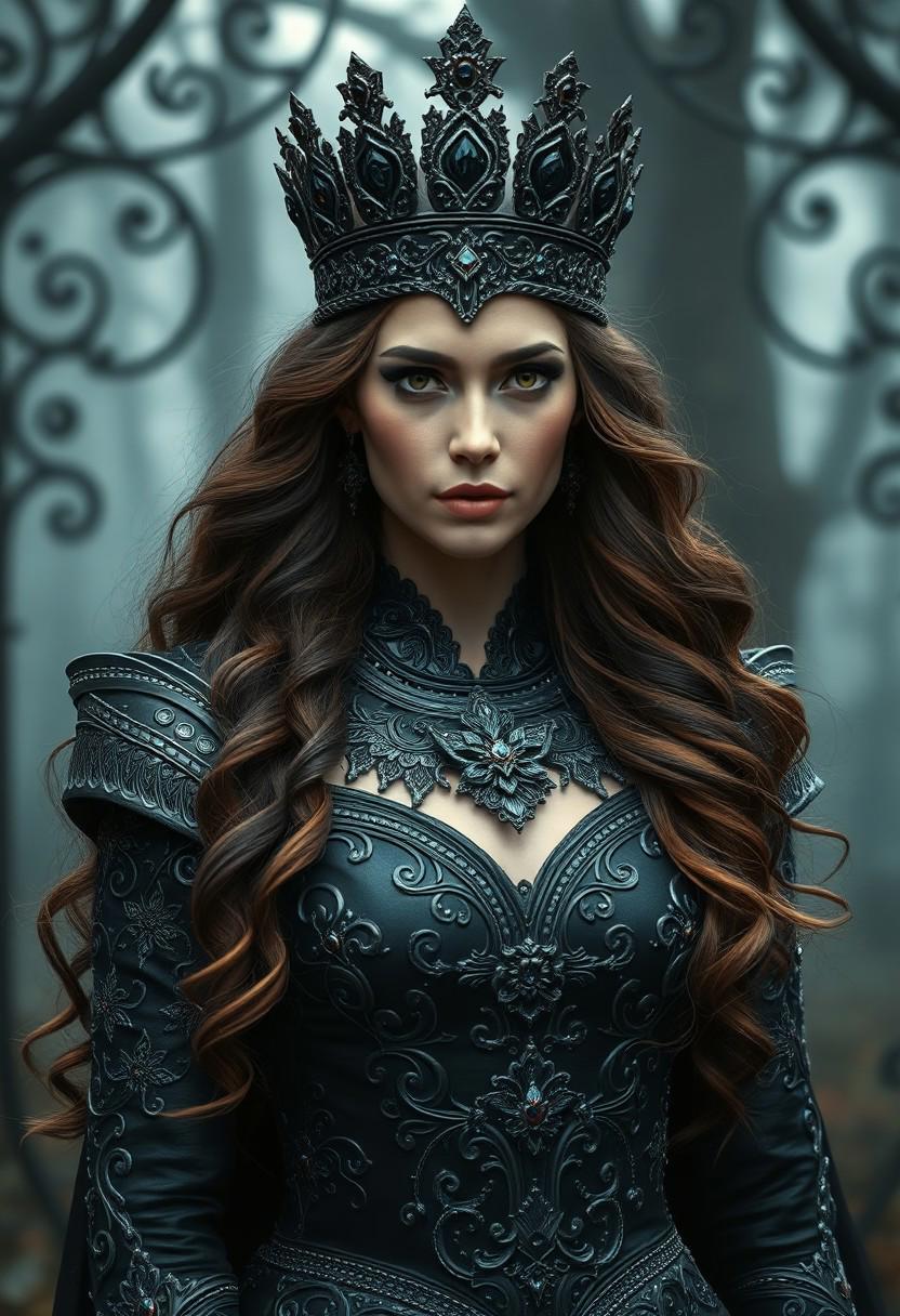 medium close-up photorealistic of a regal dark fantasy queen standing in an ethereal gothic forest. She wears an intricately designed black and silver armored gown adorned with ornate embroidery and gemstone embellishments. Her long wavy brown hair flows gently, crowned with an elaborate blackened silver crown encrusted with jewels. Her eyes are expressive and dignified. The atmosphere is mysterious and serene, with diffused ambient light filtering through misty, bluish-gray forest shadows. The background features intricate wrought iron patterns and blurred trees, suggesting a mystical palace garden. Color Grading: muted cool tones, teal and steel blue shadows, soft desaturated midtones, slight warm tint in skin tones, cinematic contrast. Highlights gently lifted to create a foggy ambiance.