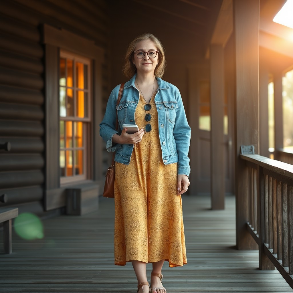 masterpiece full-body portrait of a casually dressed woman outdoors::1.4, rustic natural light photography style::1.2, realistic digital painting::1.1, (physical description: adult woman, medium to full build, standing facing the viewer, wearing eyeglasses, holding a phone or book:1.1) (facial features, expression: soft, relaxed expression, natural lighting on face:1.0) (clothing details: denim jacket or shirt over a patterned midi dress in yellow and brown tones, open-toed sandals:1.0) (accessories: eyeglasses, possibly subtle jewelry or practical bag, anklets, and metal jewelry,:0.9) (background setting: outdoor porch or deck area with rustic elements—building with dark siding and log cabin features, one window glowing with warm interior light:0.9) (lighting style: bright sunlight with noticeable glare or lens flare, emphasizing the warmth and clarity of day:0.8) (composition and camera framing: full-body shot centered on the subject, naturalistic framing with a slight tilt to capture architectural details:1.0) (emotional tone or theme: calm, grounded, and rustic with a hint of domestic coziness:0.9) (technical execution: realistic digital texture on clothing and wood grain, warm contrast between sunlit elements and shadows, strong subject focus with soft background:0.8)