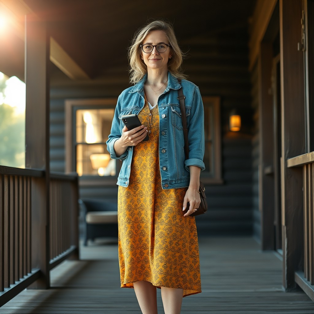 masterpiece full-body portrait of a casually dressed woman outdoors::1.4, rustic natural light photography style::1.2, realistic digital painting::1.1, (physical description: adult woman, medium to full build, standing facing the viewer, wearing eyeglasses, holding a phone or book:1.1) (facial features, expression: soft, relaxed expression, natural lighting on face:1.0) (clothing details: denim jacket or shirt over a patterned midi dress in yellow and brown tones, open-toed sandals:1.0) (accessories: eyeglasses, possibly subtle jewelry or practical bag, anklets, and metal jewelry,:0.9) (background setting: outdoor porch or deck area with rustic elements—building with dark siding and log cabin features, one window glowing with warm interior light:0.9) (lighting style: bright sunlight with noticeable glare or lens flare, emphasizing the warmth and clarity of day:0.8) (composition and camera framing: full-body shot centered on the subject, naturalistic framing with a slight tilt to capture architectural details:1.0) (emotional tone or theme: calm, grounded, and rustic with a hint of domestic coziness:0.9) (technical execution: realistic digital texture on clothing and wood grain, warm contrast between sunlit elements and shadows, strong subject focus with soft background:0.8)