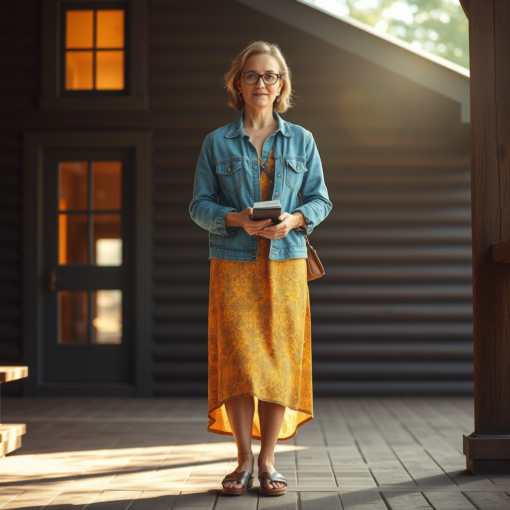 masterpiece full-body portrait of a casually dressed woman outdoors::1.4, rustic natural light photography style::1.2, realistic digital painting::1.1, (physical description: adult woman, medium to full build, standing facing the viewer, wearing eyeglasses, holding a phone or book:1.1) (facial features, expression: soft, relaxed expression, natural lighting on face:1.0) (clothing details: denim jacket or shirt over a patterned midi dress in yellow and brown tones, open-toed sandals:1.0) (accessories: eyeglasses, possibly subtle jewelry or practical bag, anklets, and metal jewelry,:0.9) (background setting: outdoor porch or deck area with rustic elements—building with dark siding and log cabin features, one window glowing with warm interior light:0.9) (lighting style: bright sunlight with noticeable glare or lens flare, emphasizing the warmth and clarity of day:0.8) (composition and camera framing: full-body shot centered on the subject, naturalistic framing with a slight tilt to capture architectural details:1.0) (emotional tone or theme: calm, grounded, and rustic with a hint of domestic coziness:0.9) (technical execution: realistic digital texture on clothing and wood grain, warm contrast between sunlit elements and shadows, strong subject focus with soft background:0.8)
