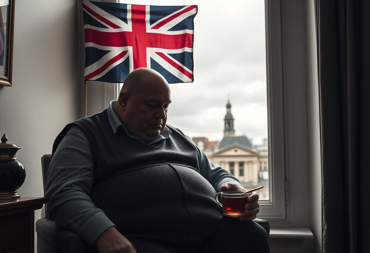 farewell from the UK, Union Jack Flag limp and pathetic hangs on the wall, a fat bald man sits and stares sadly at a half-empty cup of tea, he's wearing a string vest, outside the window the gloomy grey sky matches his gloomy mood