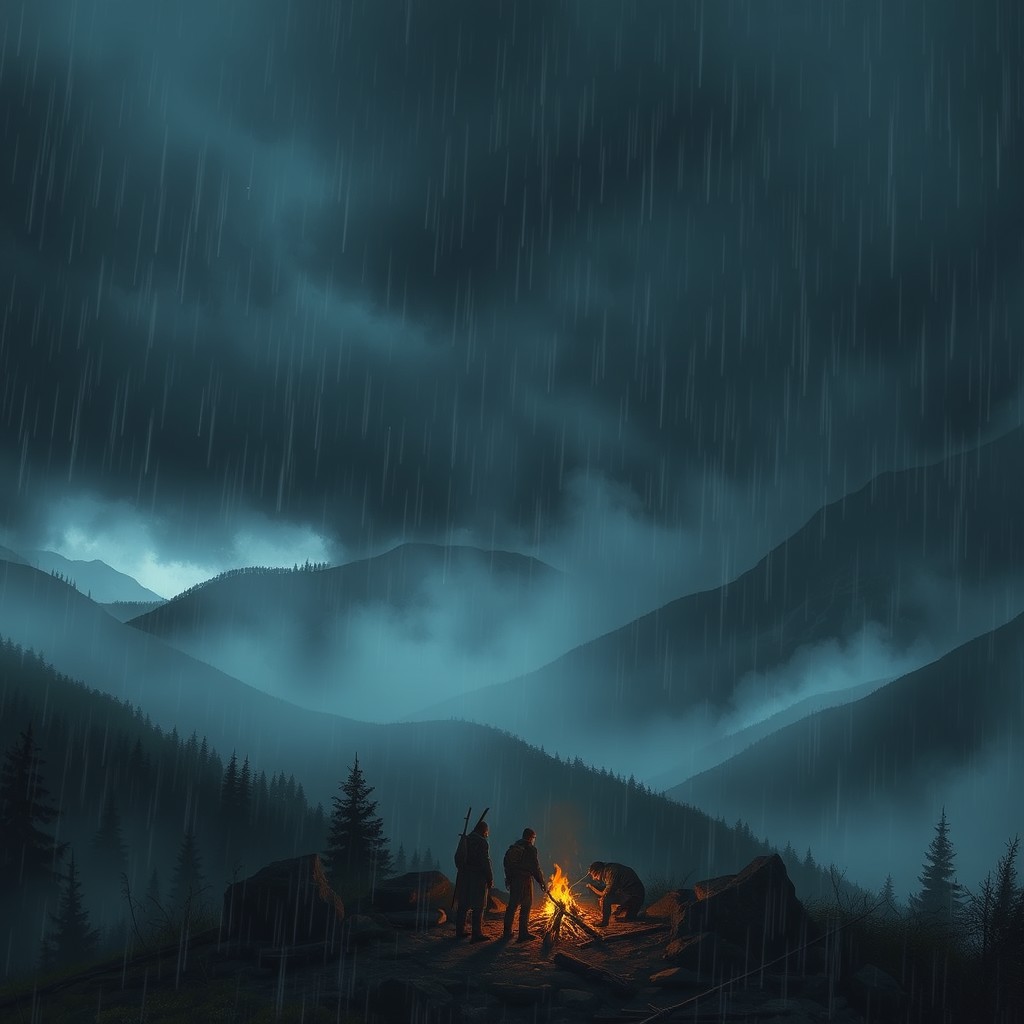 midnight storm, heavy rain, mist, mountains, rivers and forests, a distant view of a group of adventurers huddle near a small fire