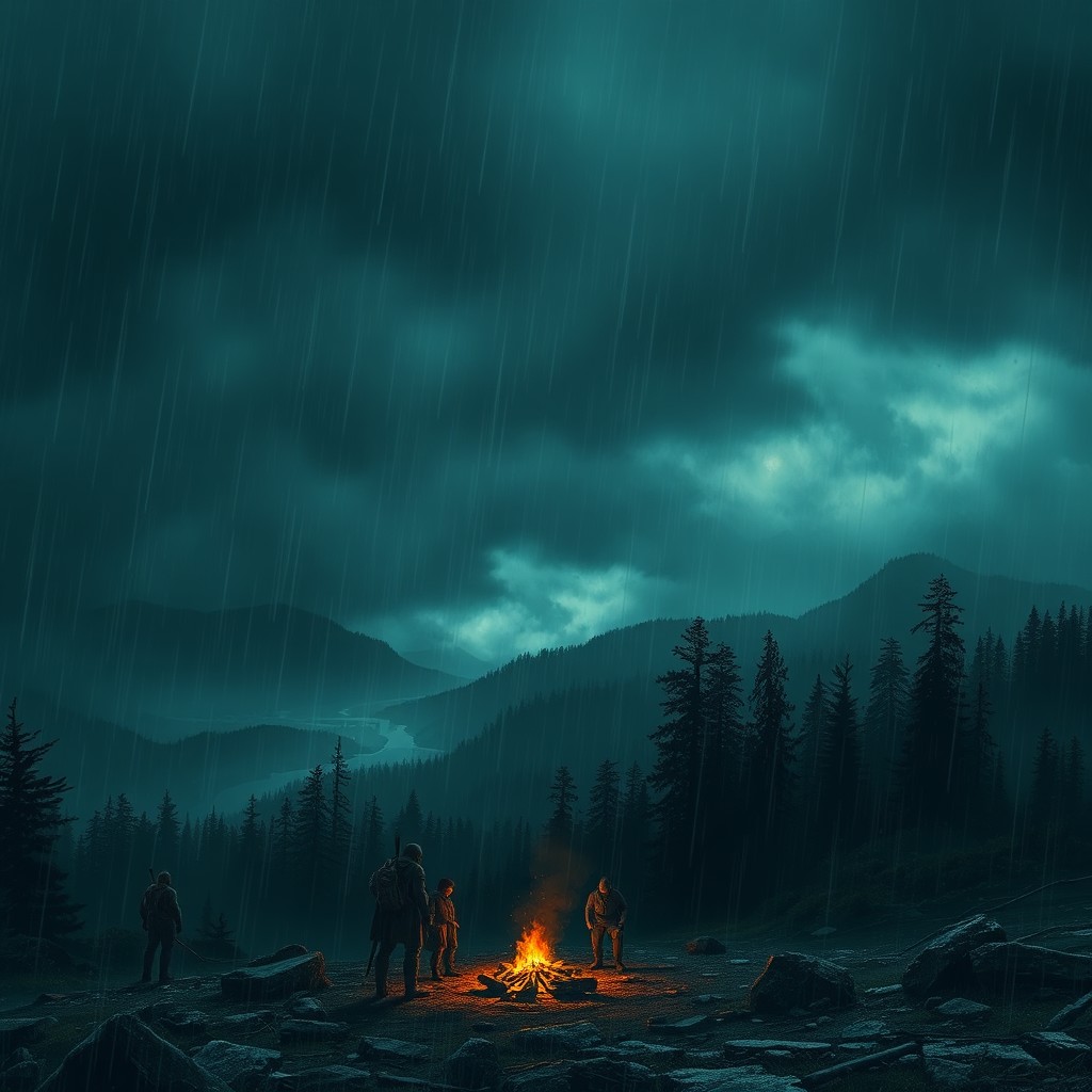 midnight storm, heavy rain, mist, mountains, rivers and forests, a distant view of a group of adventurers huddle near a small fire