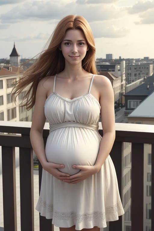 head on photo of Claudia, feminine woman, 24 yearsold, fit body, toned body, lithe body, supple body, pert d cups, sunburnt skin, tanlines, birthmarks, shoulderlength auburn wavey hair, oblong face, fine features, arched eyebrows heterochromia, round eyes, fleshy upturned nose, thin lips, upturned lips wearing a flowing laced sundress, PregDef, pregnant, big belly, standing at a balcony balustrade, happy, smiling, giddy, rim lighting, studio shot, poster design, wallpaper design, RAW, highres, 8k, uhd, High Dynamic Range, tonemapping, crisp details,